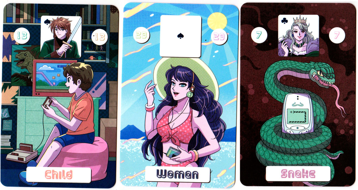 Above: A selection of cards from the Back to the 80s Lenormand includes: The Child card depicting a boy playing a Famicom game console (known as the Nintendo Entertainment System in the West), The Woman card with an image of a Walkman, and The Snake card featuring an old Nokia phone playing the 'Snake' game, intertwined with a green snake.