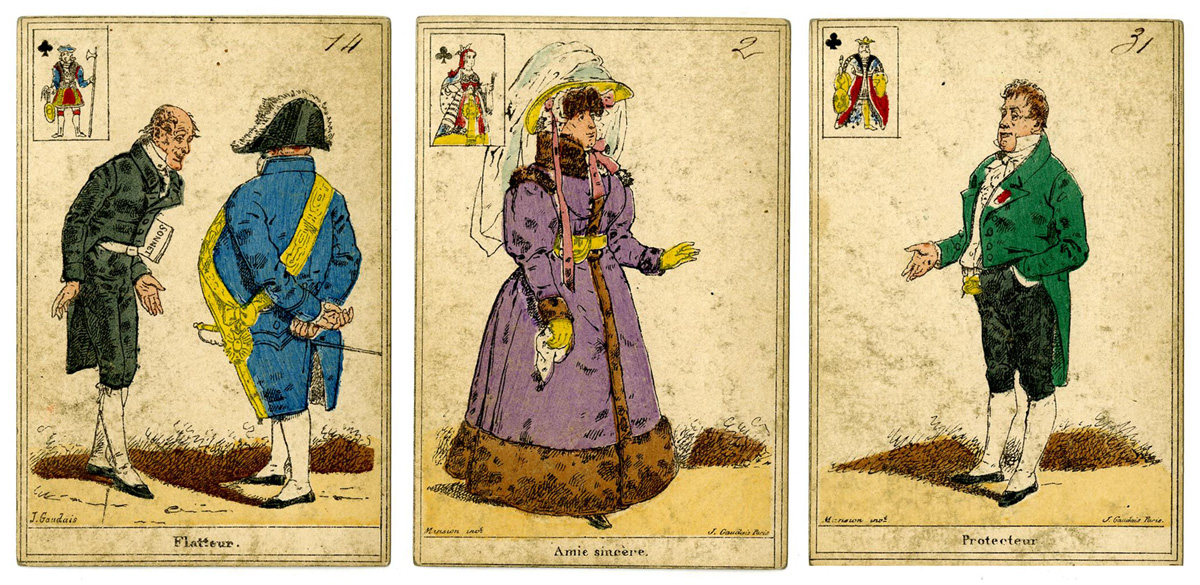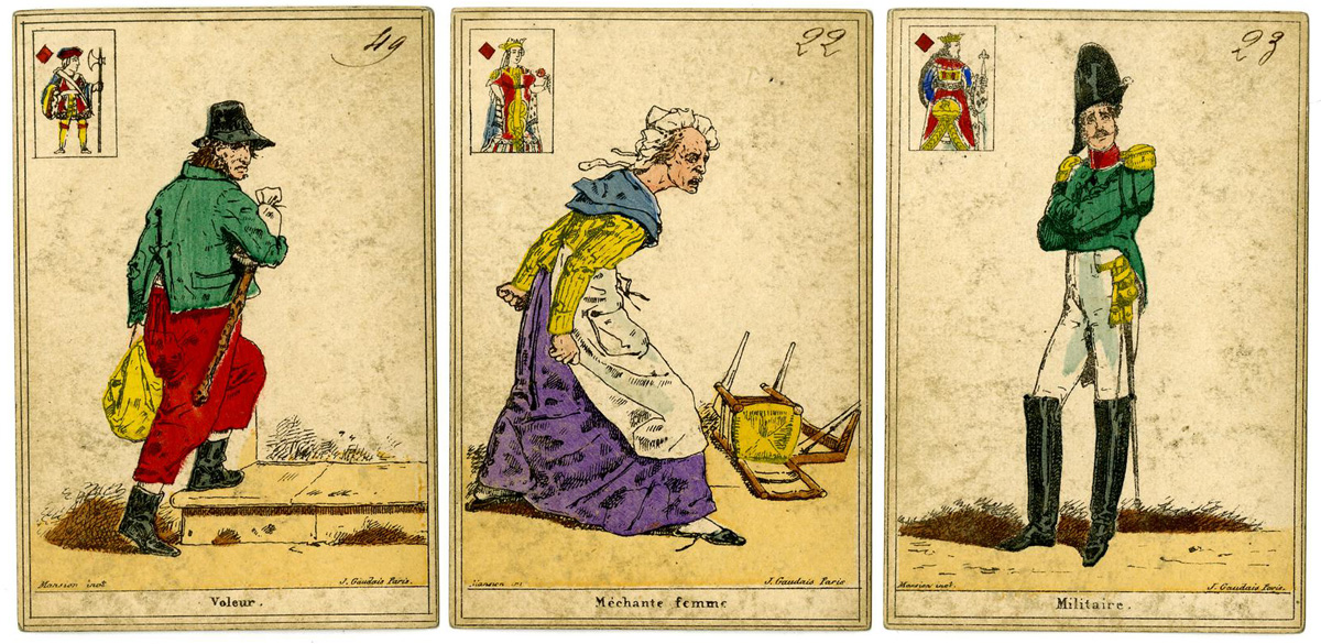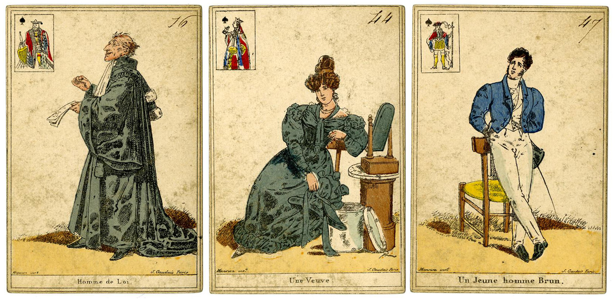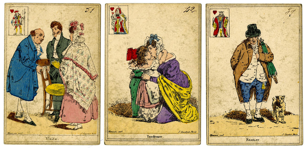 Above: French Cartomancy cards, 52 cards, hand-coloured lithograph, backs printed with a plaid pattern, published by J. Gaudais; printed by Mansion, Paris, c.1830. Mansion's name is on every card, and Gaudais' on some of them. © The Trustees of the British Museum • Cartomancy cards, Paris, c.1830►