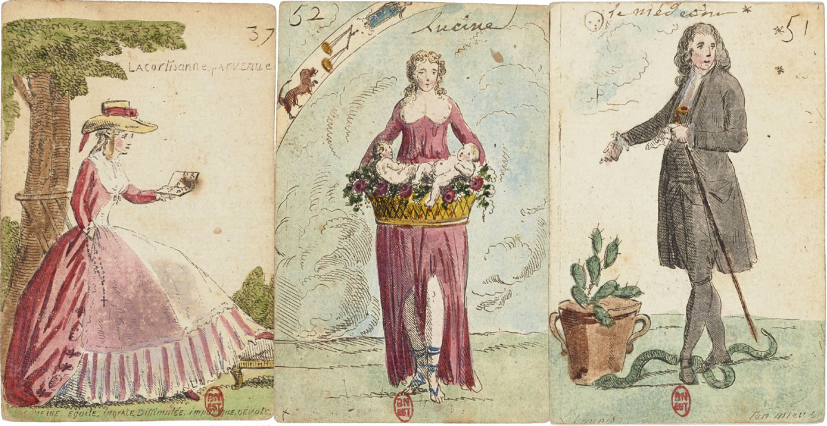 This early French cartomancy deck was published in 1788, and contains 66 cards with a variety of everyday figures, domestic scenes, as well as mythological figures. The titles of the cards are inscribed in brown ink. Although the set is described as "Cartomancy game for the amusement of Ladies", it is more or less contemporary with Antoine Court de Gébelin’s claims for the Egyptian origins of Tarot (1781) and also Jean-Baptiste Alliette’s book about tarot divination (1770) and his series of tarot decks for that purpose, which aroused more interest in these topics. The repertoire of imagery can be traced back to a blend of allegories and symbols from various cultures and historical periods, which were familiar to people of the time and served for self-reflection and prophecy. Cartomancy was evolving into a new form of parlour entertainment, which progressed into Mlle. Lenormand decks of the 19th century, with which people began to enquire about their destinies.