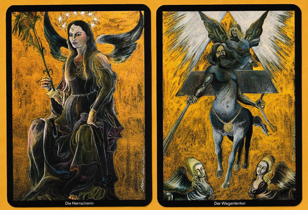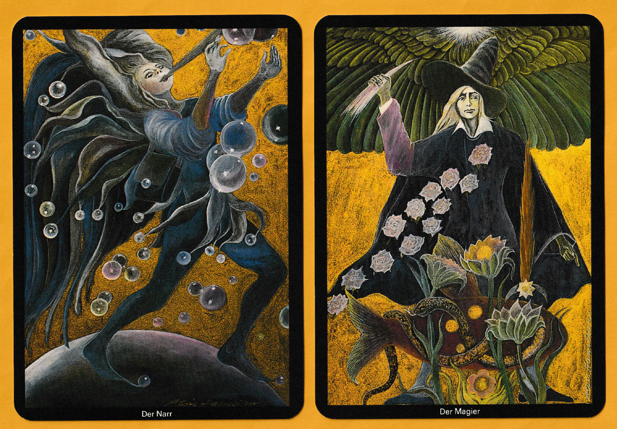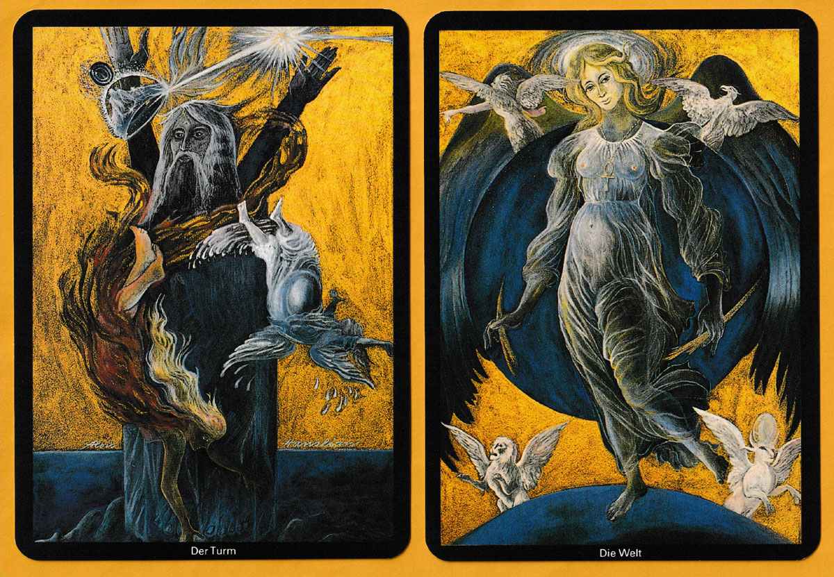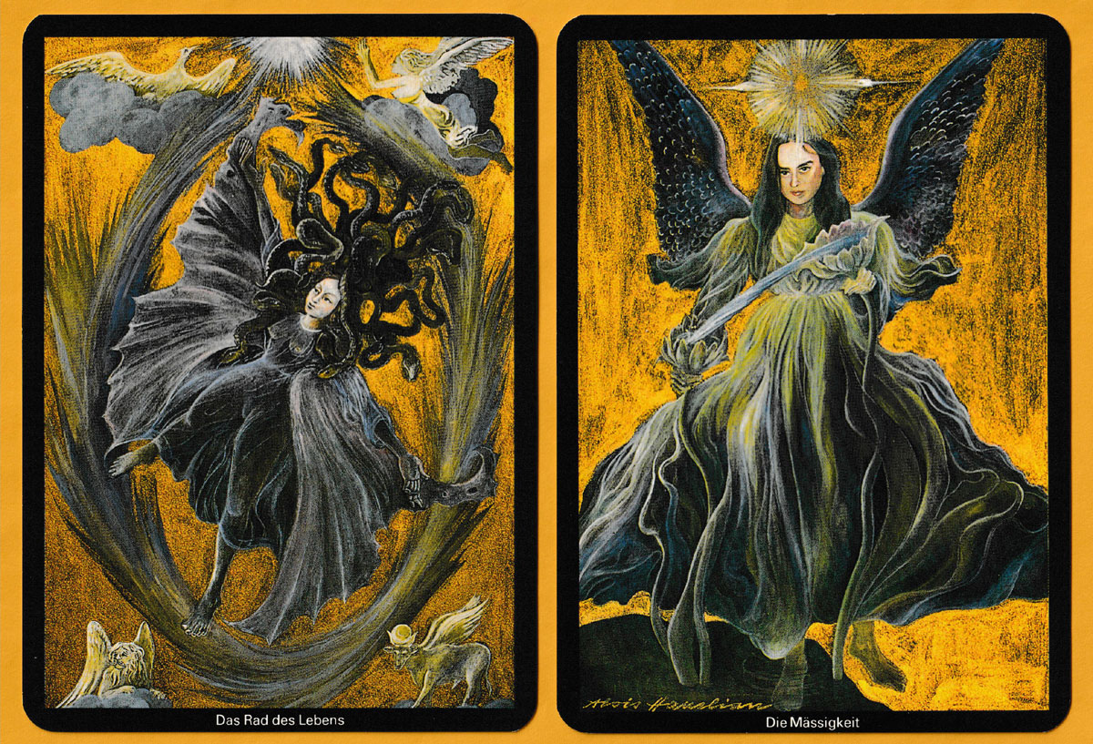 Angels in their many guises are present throughout this pack designed by the German artist Alois Hanslian (b.1943). Each extra-large image is set against a mustard- or gold-coloured background which adds unity to the ensemble. The figure on The World (Die Welt) card is reminiscent of the work of Botticelli. The cards have black borders but are not numbered; instead, the card title in German appears in white at the foot of each card. The backs are plain white and unvarnished. The extensive book in German describes every card in detail and includes various layouts • See the box