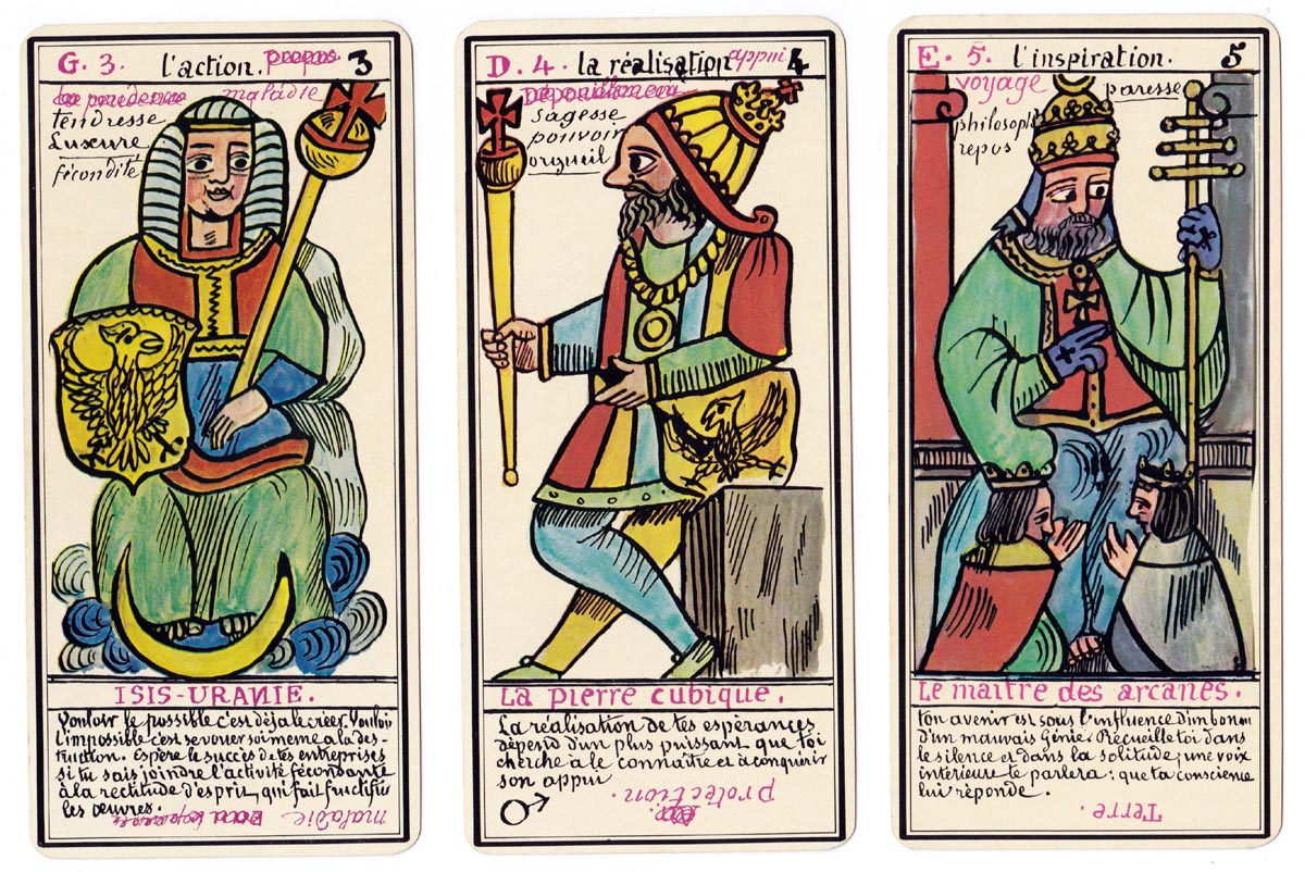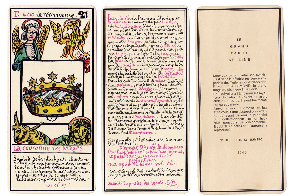 Le Grand Tarot Belline was produced after drawings by Edmond Billaudot (1829-1881) who was also known as Magus Edmond. It superficially resembles the Tarot de Marseille, but differs from it in time, design and symbolism, especially the numeral cards. The deck bequeaths ideas from a succession of well-known 18th & 19th century occultists and incorporates kabalistic, astrological and Egyptian influences, as well as the philosophical musings of Edmond Billaudot himself. A condensed cartomantic interpretation is hand-written on each card along with esoteric symbols and glyphs which facilitate the process of abstraction.