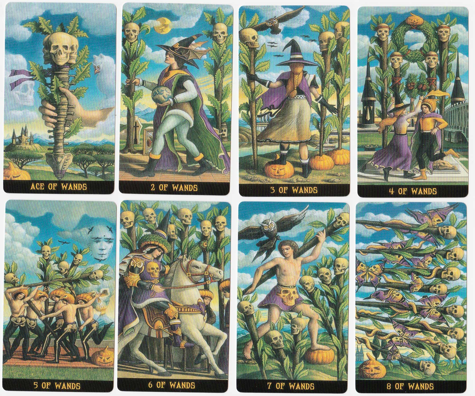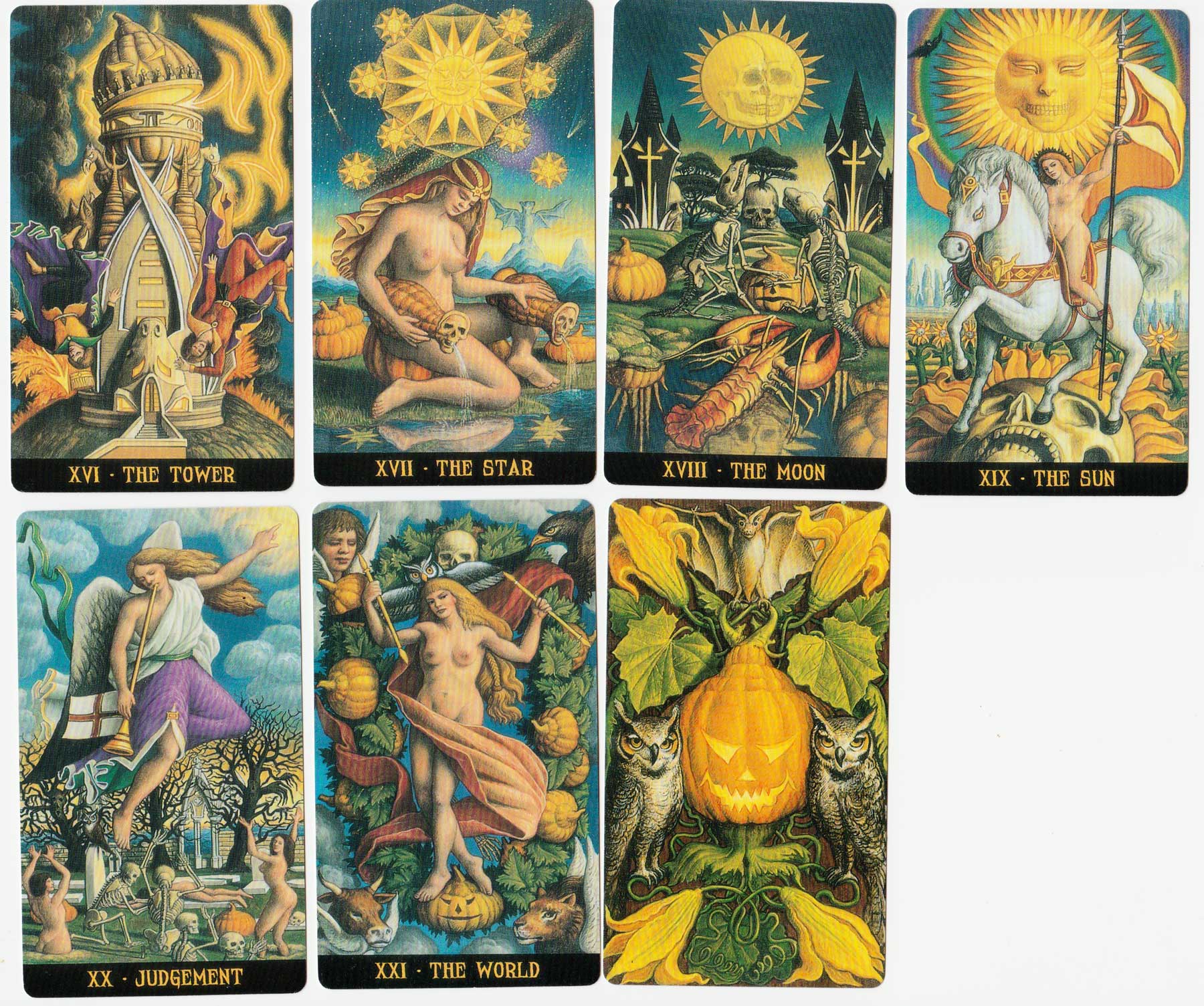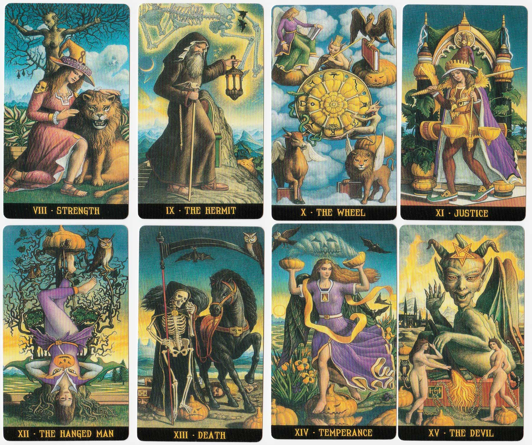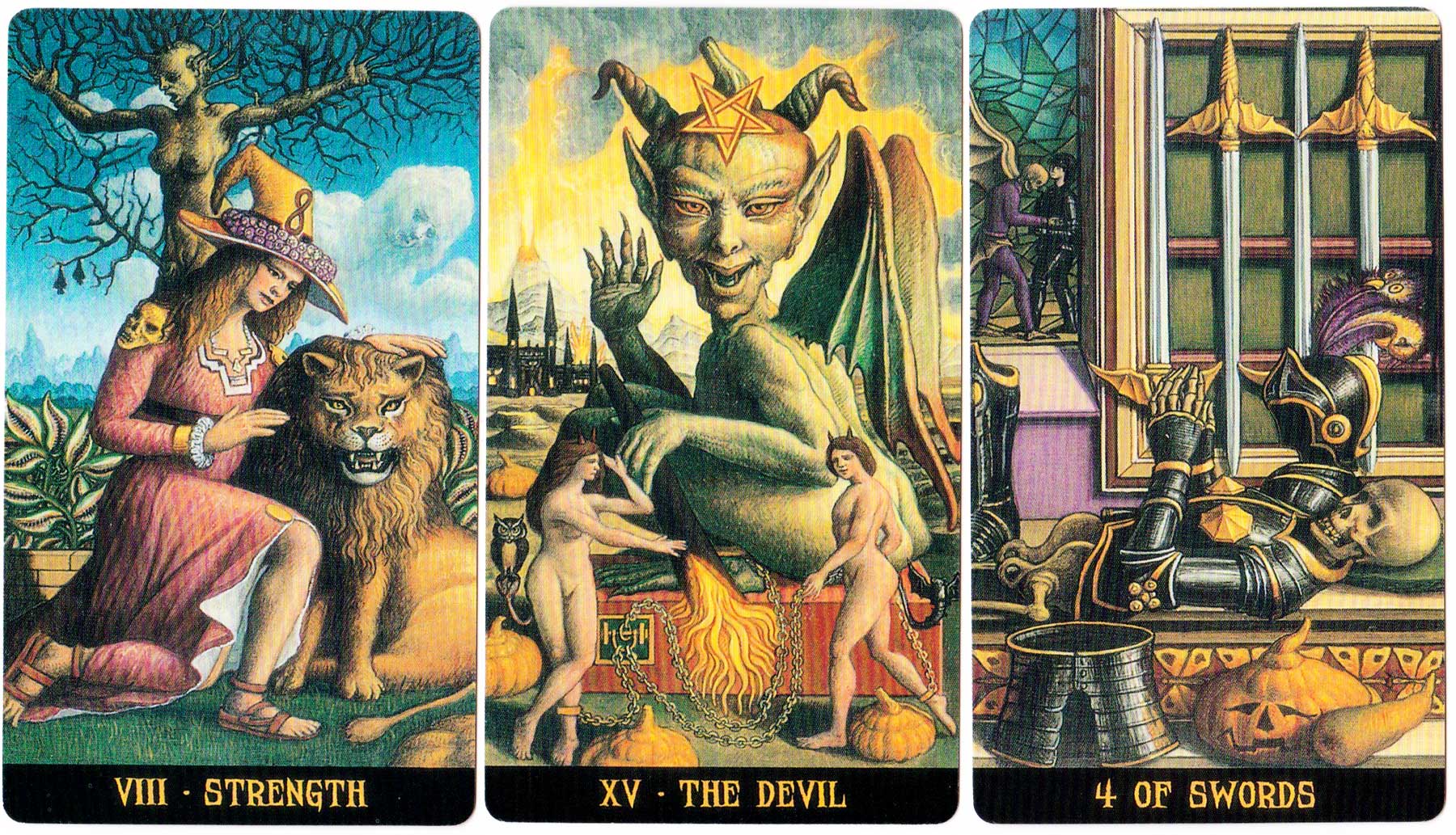 Above: A selection of cards from "Jack-O'-Lantern" tarot. The Strength card shows a vibrant woodland spirit and an ethereal figures dancing in the clouds, while the Four of Swords incorporates bat-themed armor and nods to customs with carved root vegetables.