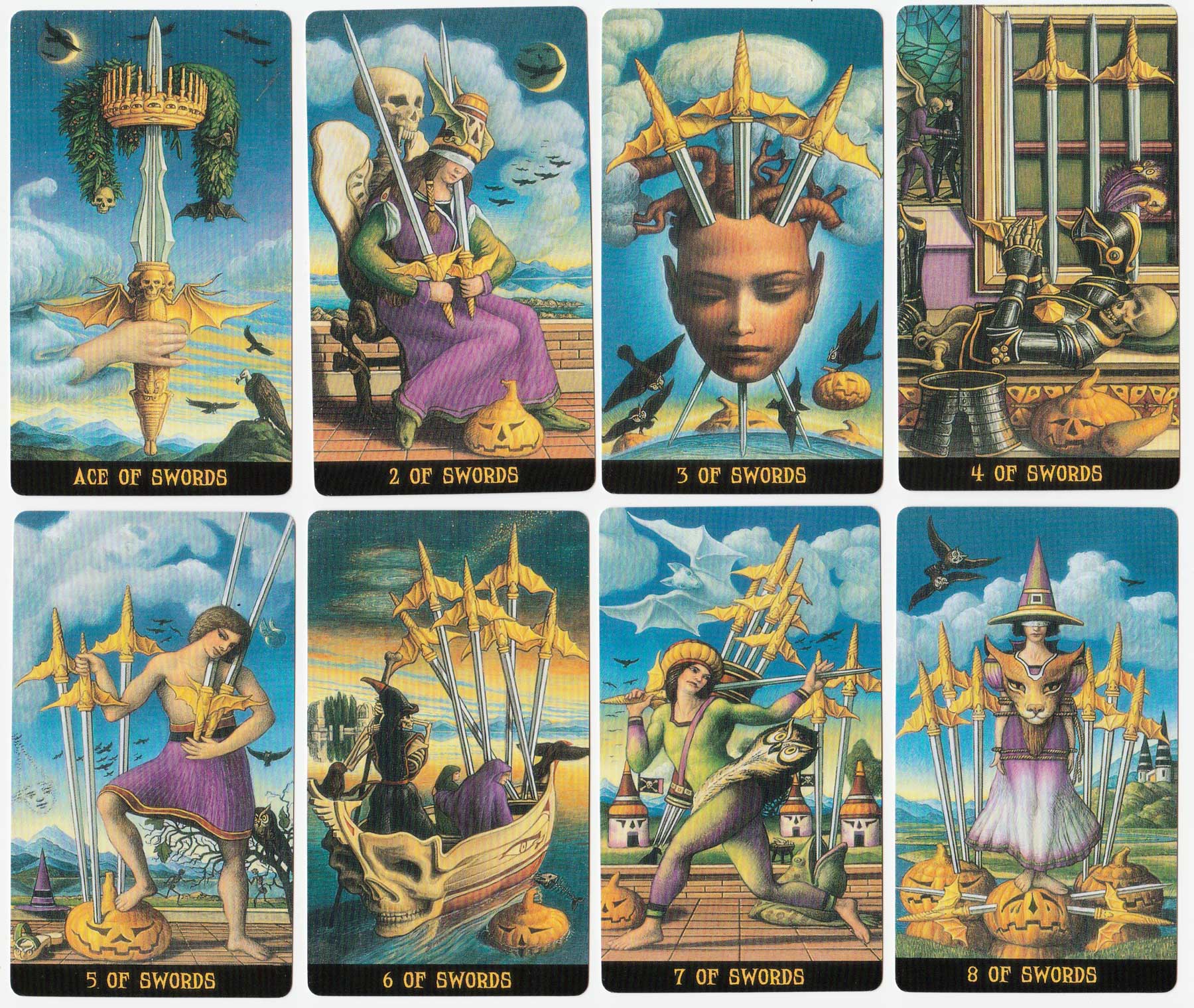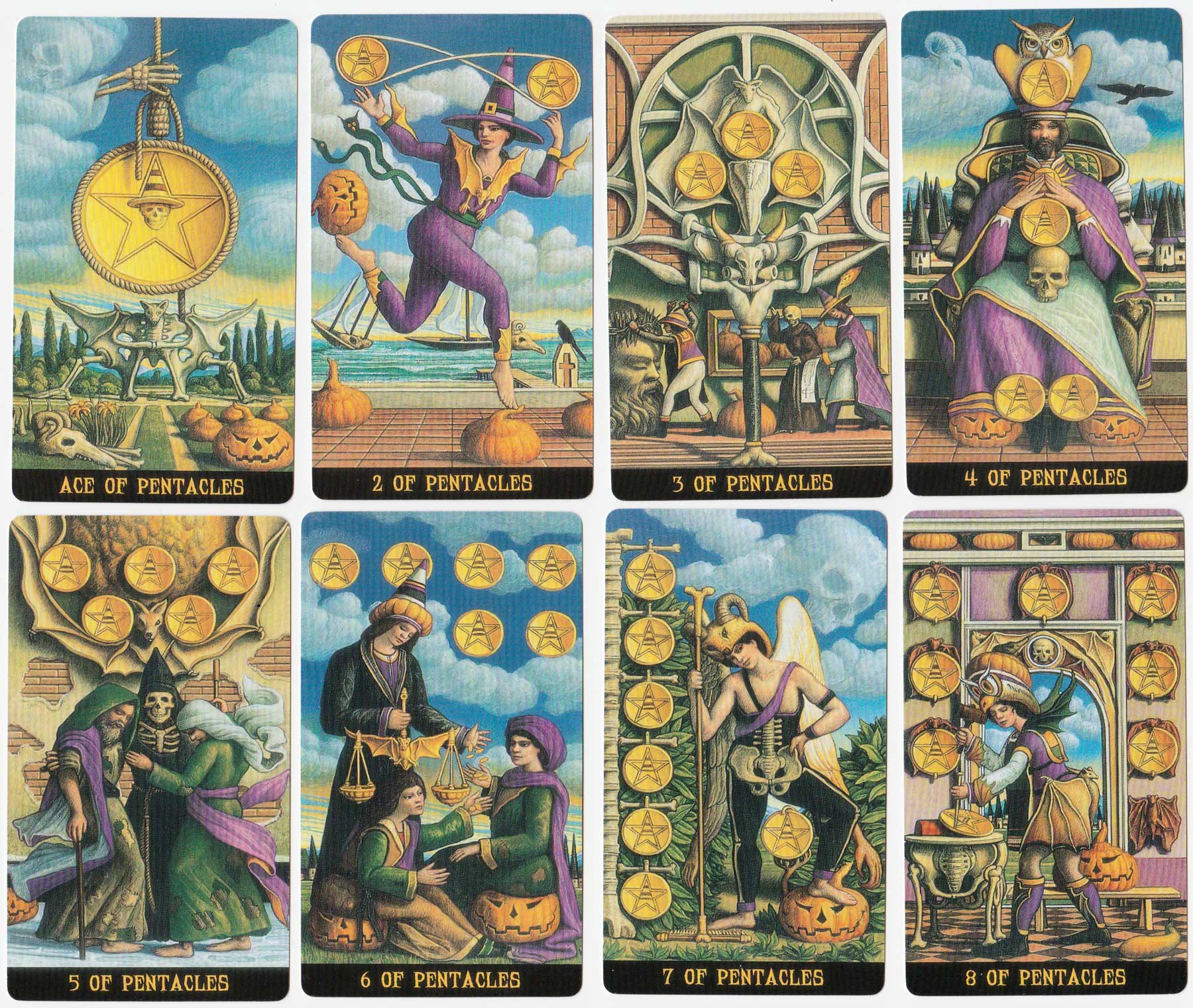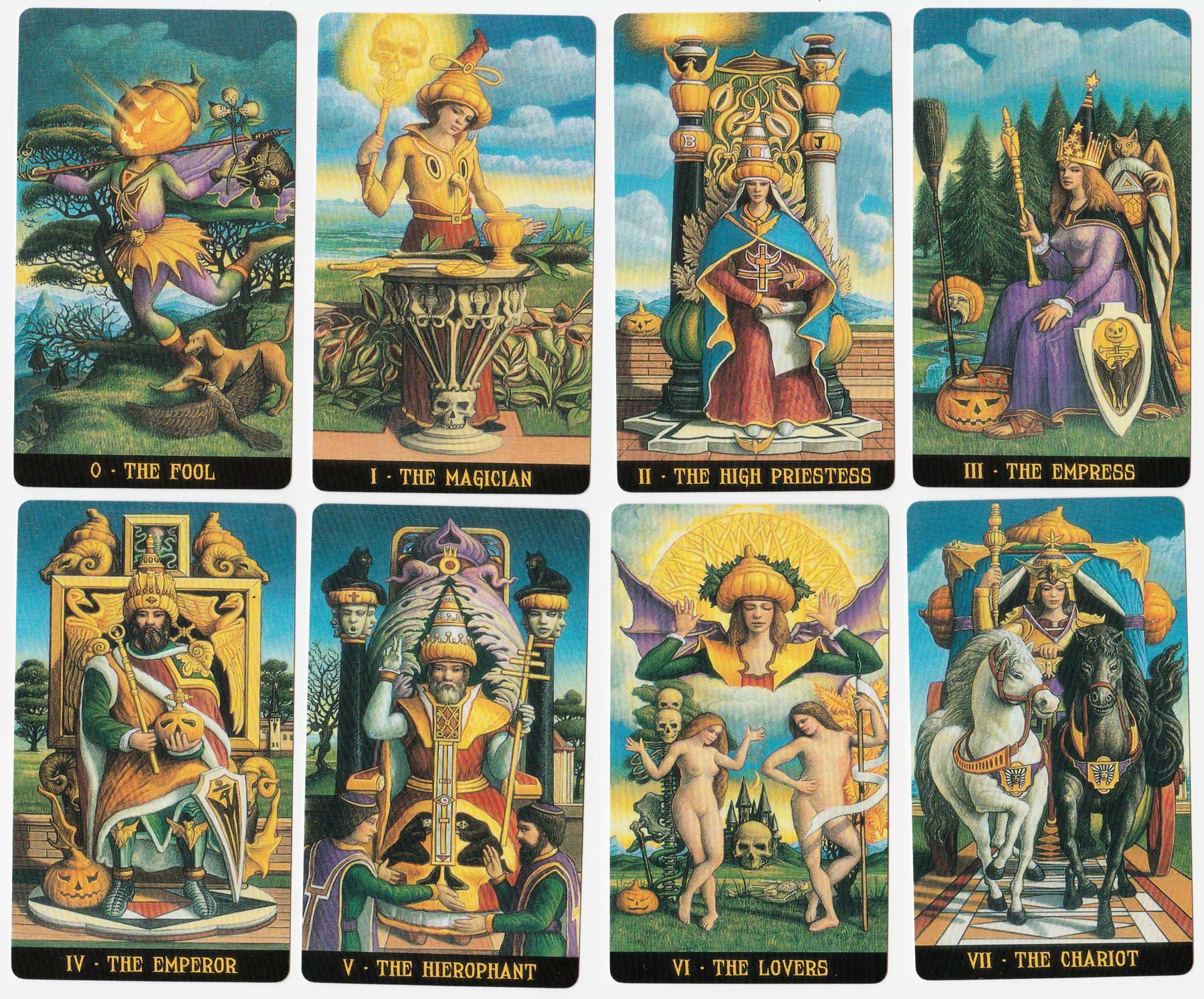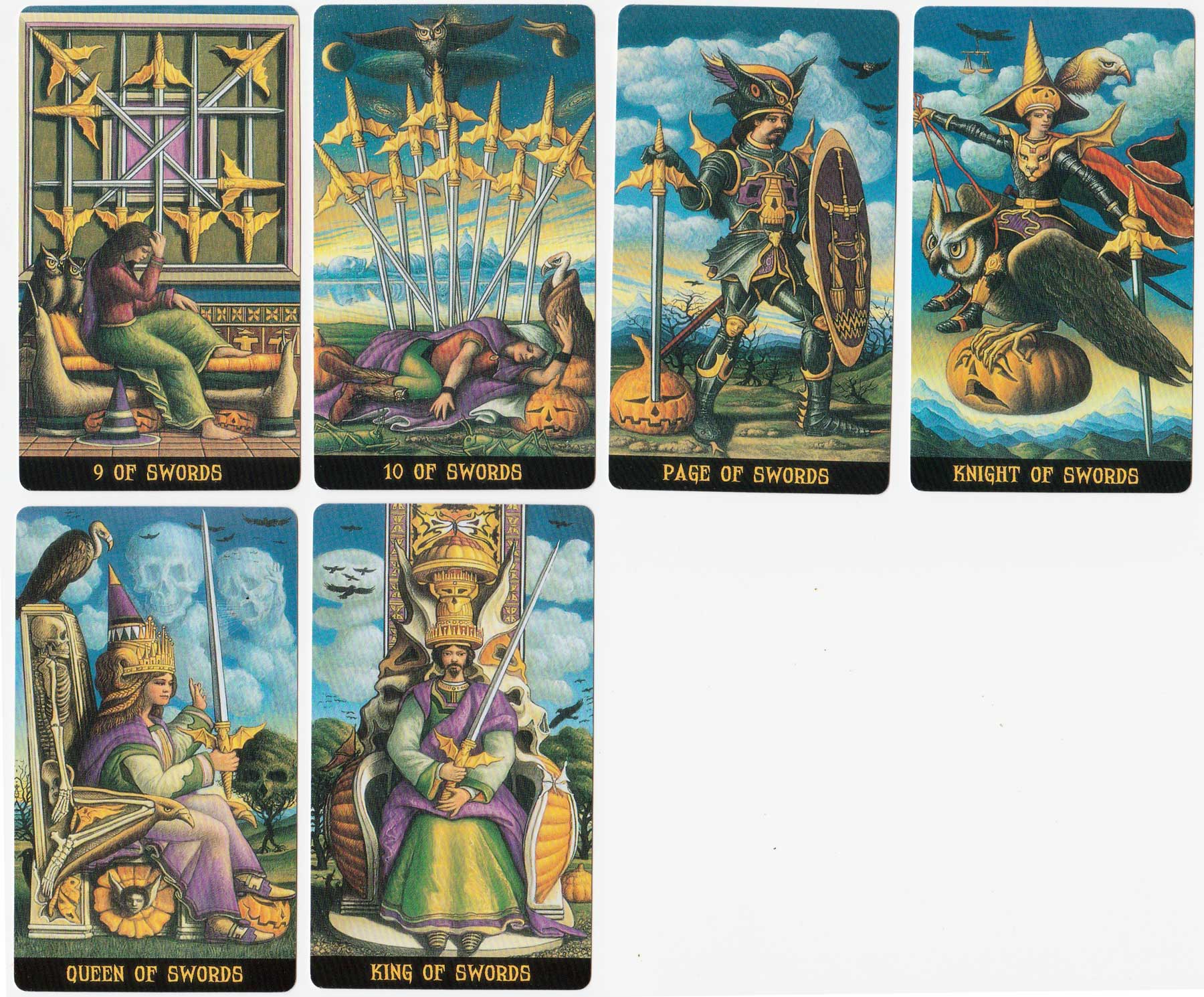 Above: A selection of cards from "Jack-O'-Lantern" tarot. The Strength card shows a vibrant woodland spirit and an ethereal figures dancing in the clouds, while the Four of Swords incorporates bat-themed armor and nods to customs with carved root vegetables.