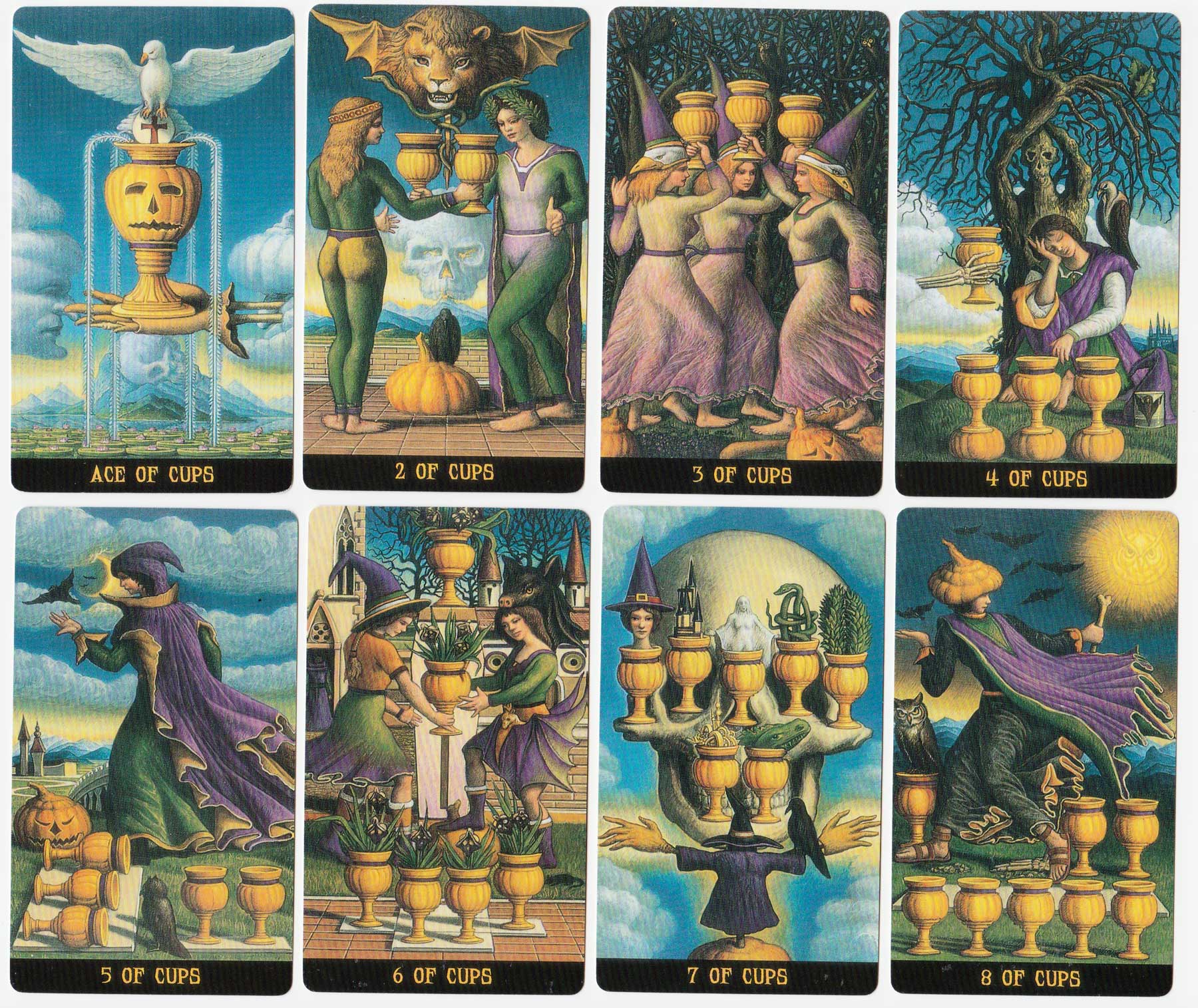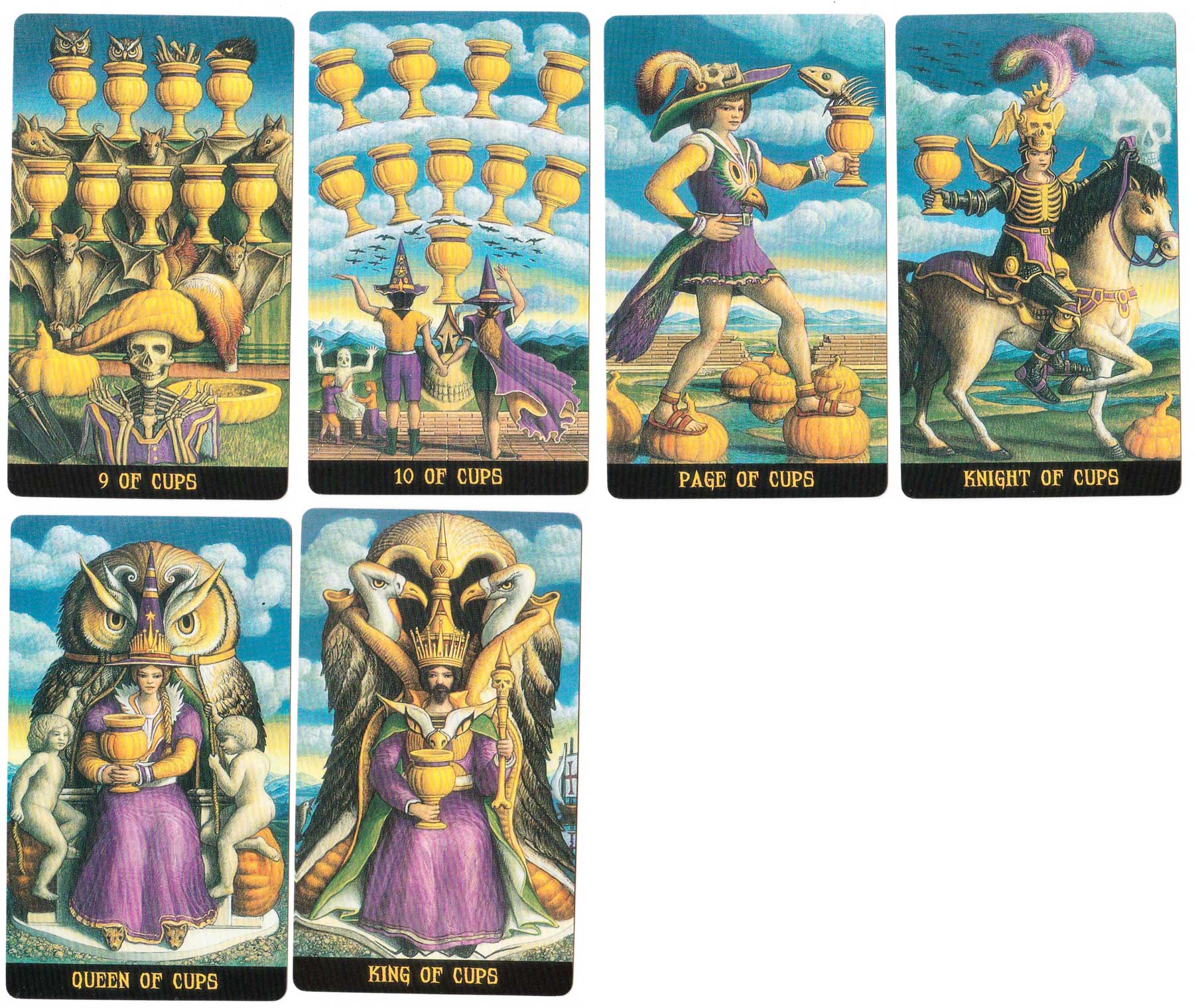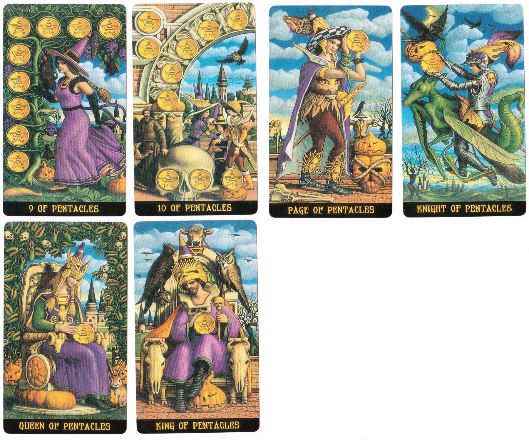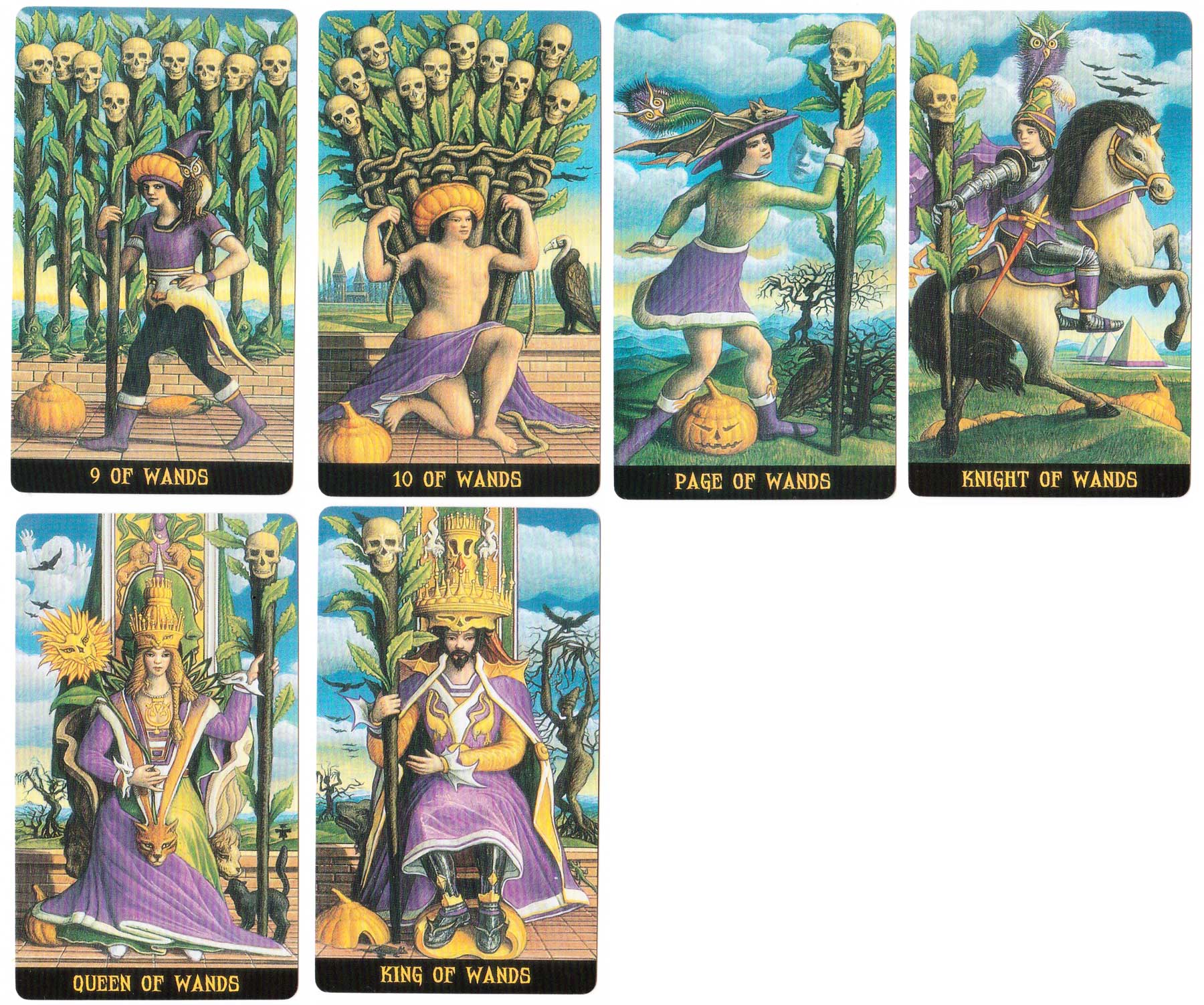 Above: A selection of cards from "Jack-O'-Lantern" tarot. The Strength card shows a vibrant woodland spirit and an ethereal figures dancing in the clouds, while the Four of Swords incorporates bat-themed armor and nods to customs with carved root vegetables.