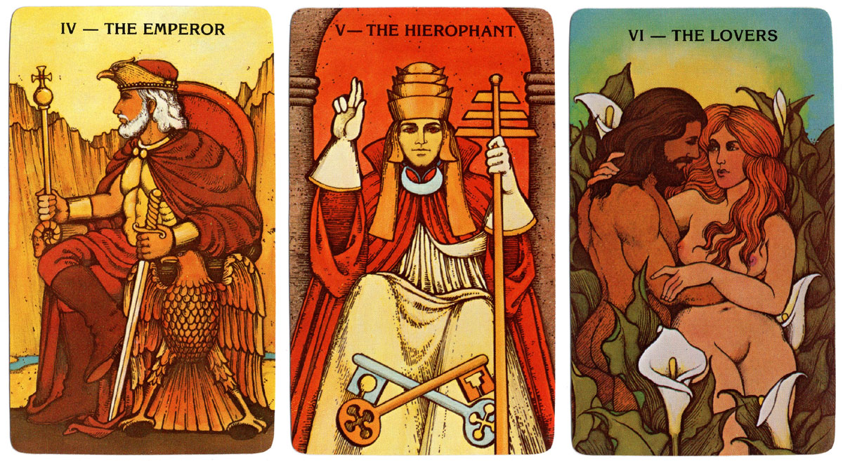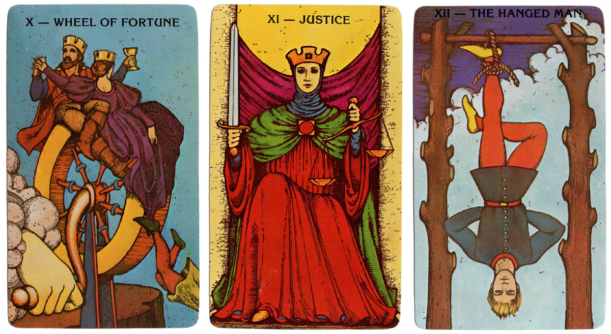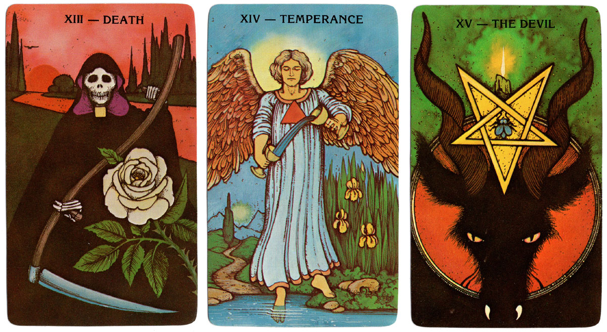 Recoloured version of the Rider/Waite/Smith tarot produced by Frankie Albano, 1968.