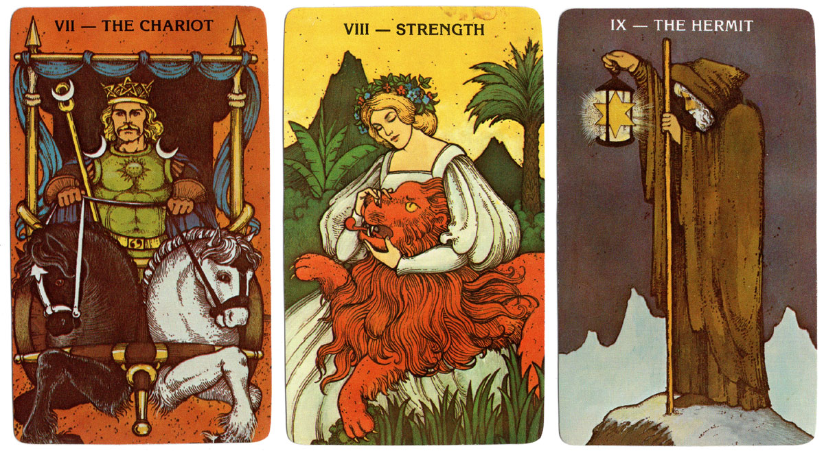 The Morgan-Greer Tarot was first published in 1979 by Morgan & Morgan, Inc., and has been a popular favourite ever since. As stated on the box, the deck is "Based on the continued knowledge, wisdom and interpretation of Paul Foster Case and Arther Edward Waite." Therefore it follows the Golden Dawn order for the trumps, with Strength at VIII and Justice at XI. But it is William Greer's bold and colourful artwork that has endeared the deck to so many, and kept the deck in print to this day. Although the images echo those of the Rider Waite Smith deck, it is as though the artist has zoomed in on the subject matter, making it more intimate and arresting.