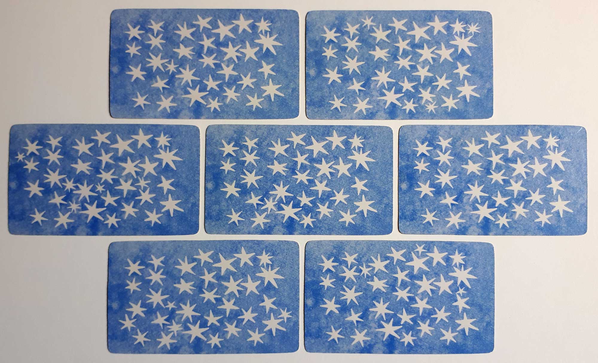 Another interesting feature of this deck is that there are 7 different back designs, all of which look the same at a glance, but in fact have several subtle differences. The basic design is of white stars on a blue background, but it is the number and size of the stars that differs. Also the first printing had a very pale wishy-washy blue background, which became darker and more solid with each successive printing, to the point where the backs of currently available decks don't even have a different number of stars anymore! The boxes have also changed over time (see the chart kindly provided by John Choma), and the deck is now even available as a mini deck in a tin. Images shown here are from a first edition example, with cards measuring 120 x 70mm.