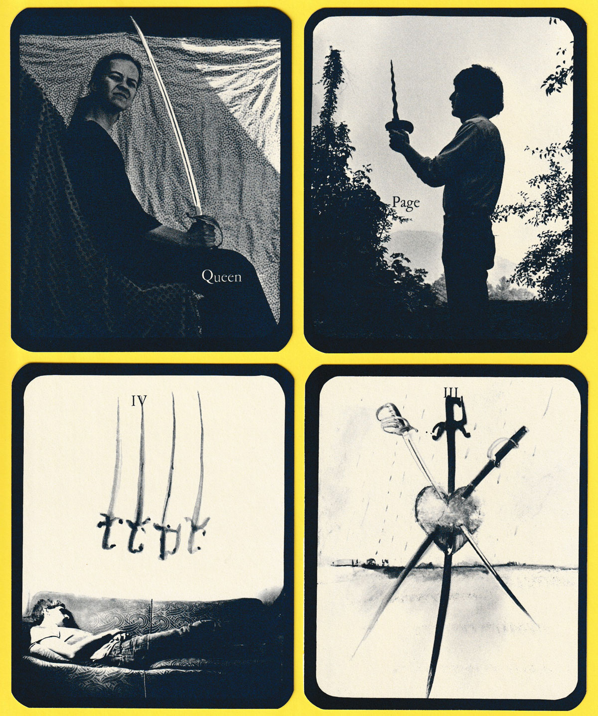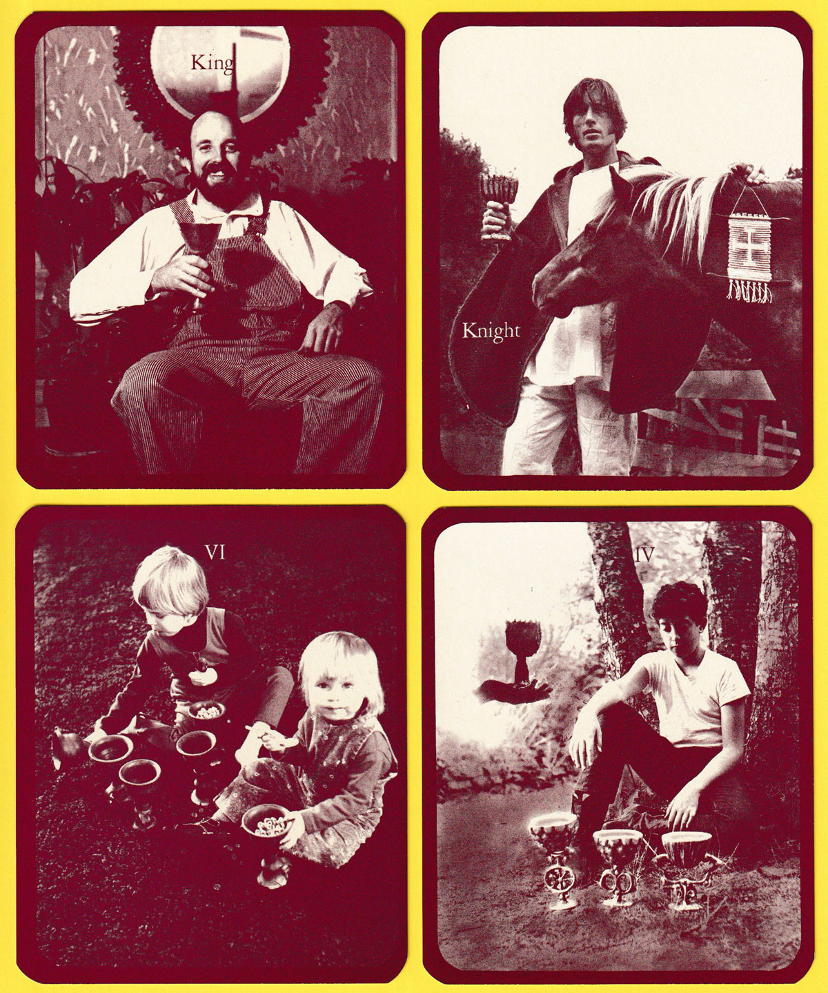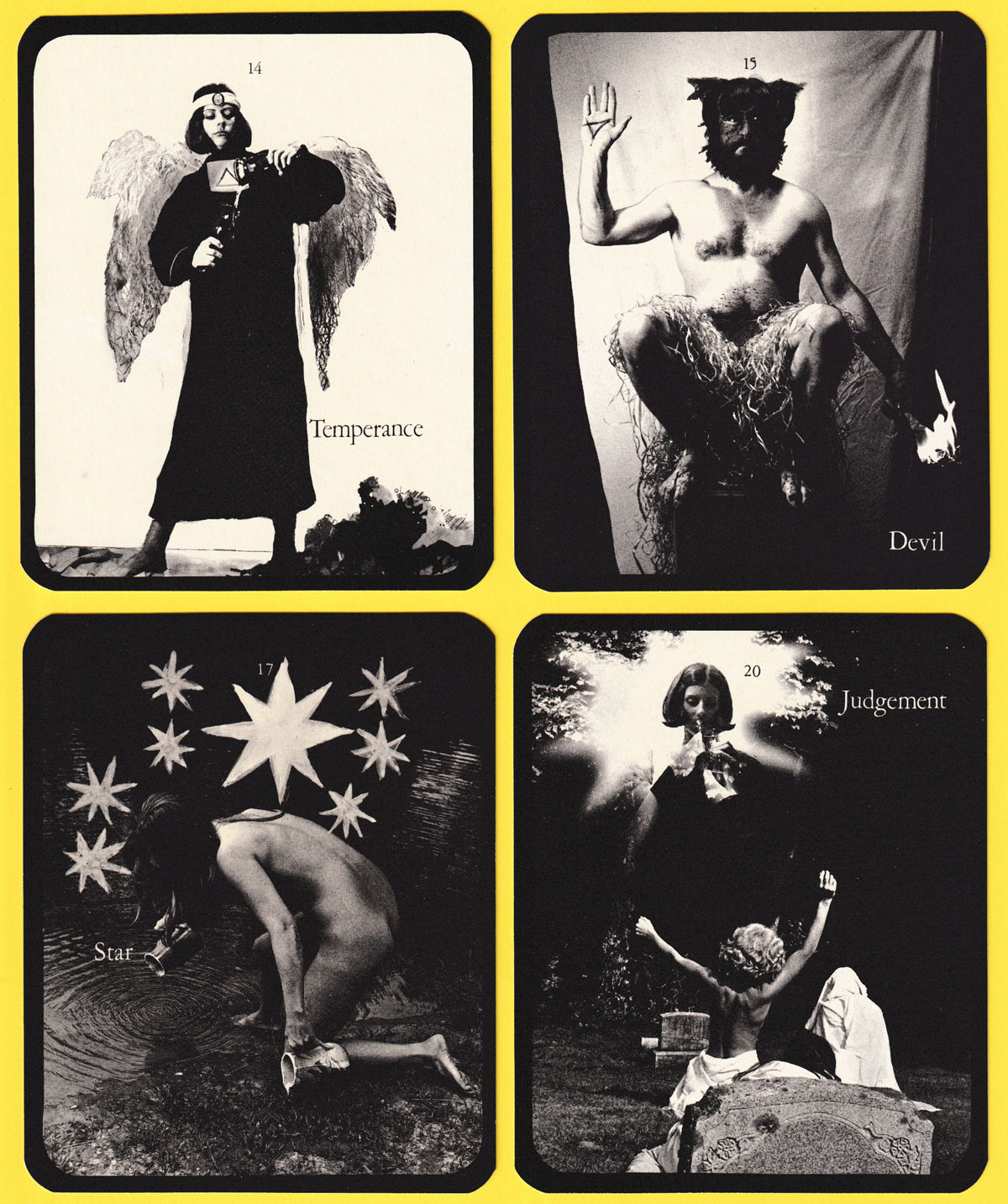 Considered to be the first complete photographic Tarot pack, it took the photographer Bea Nettles five years (1970-75) to create without the aid of digital tools. The idea came to her in a dream after she had seen line drawings in a copy of A.E. Waite’s “The Pictorial Key to the Tarot”. The images are based largely on those to be found in the (Rider-) Waite Tarot. Family members and friends from Penland School in North Carolina (where Bea Nettles was studying) were her models. Bea herself appears as the Queen of Pentacles.