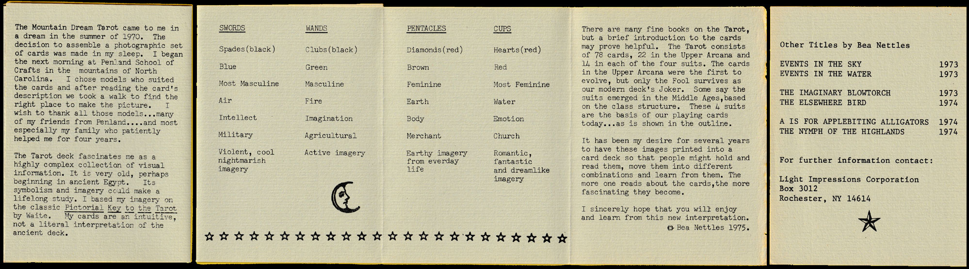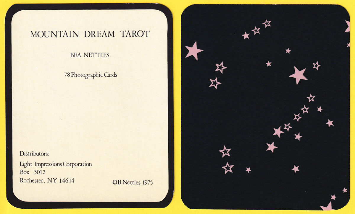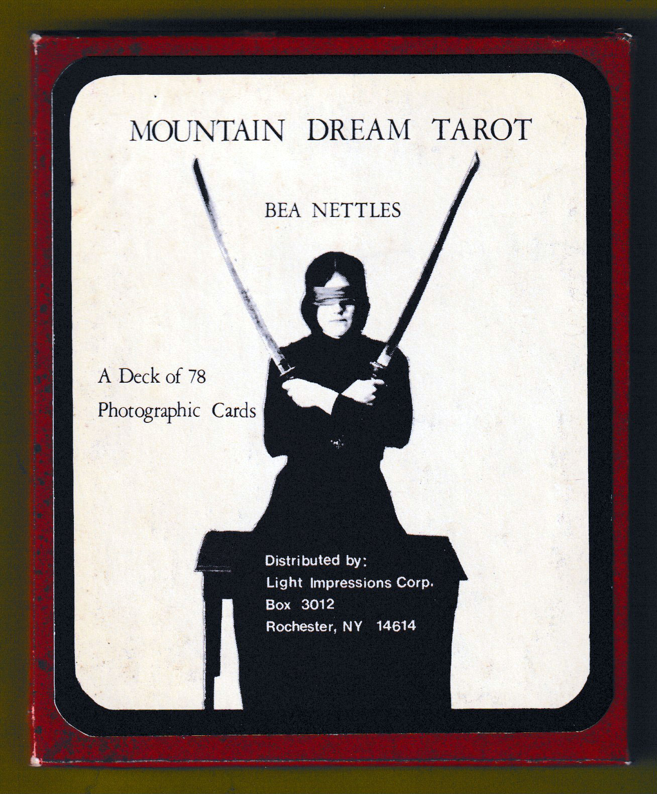 Above: Mountain Dream Tarot created by Bea Nettles, distributed by Light Impressions Corporation, Rochester, NY, USA, 1975. 78 cards + 1 title card + folded information sheet + sheet listing other titles, in drop-lid box. Size: 94 x 115 mm. © B.Nettles 1975.
