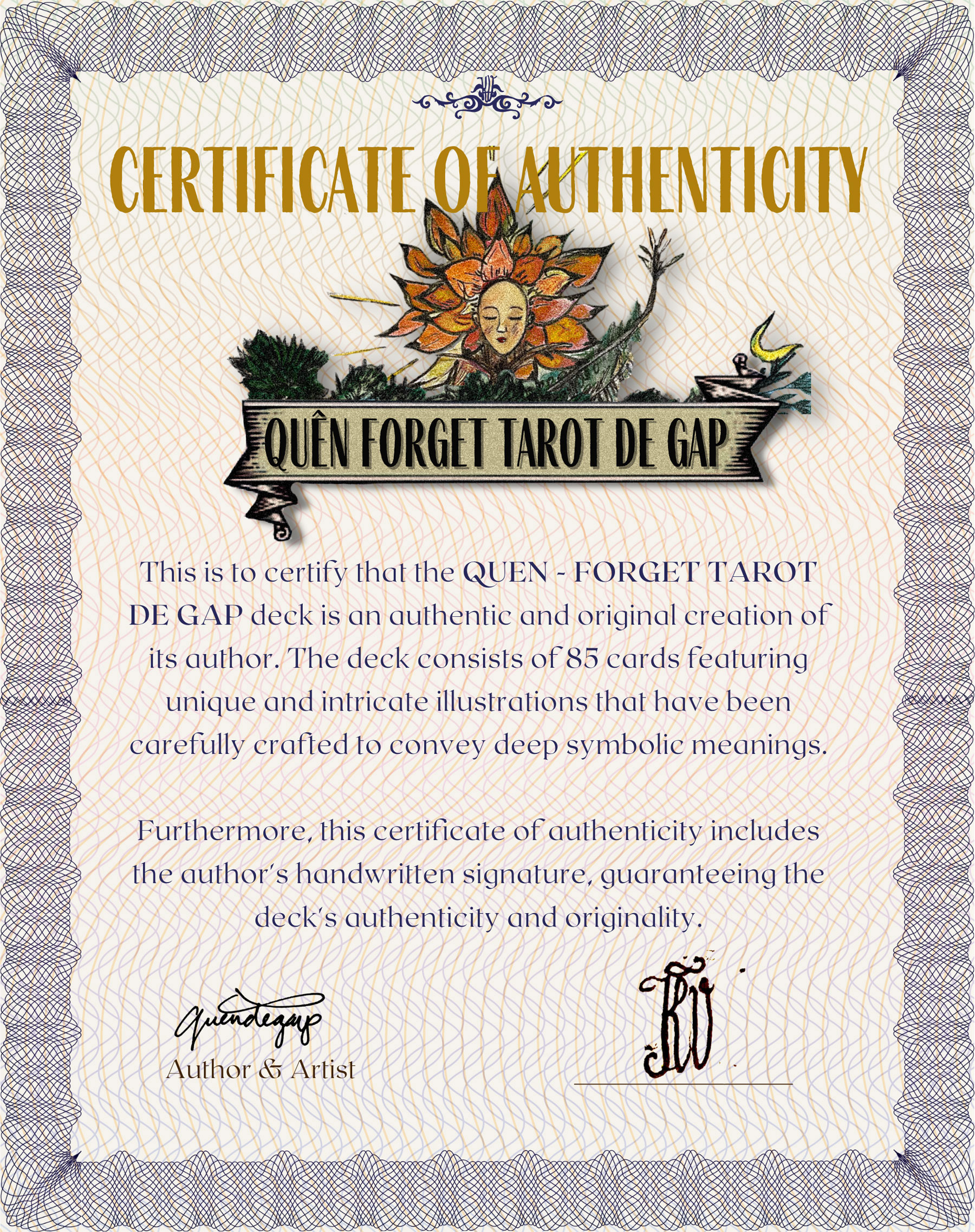 The 85-card deck is well-presented inside an elegant case with magnetic lock. A 304-page guidebook can be downloaded from a QR code (See the QR code ) on the certificate of authenticity card (See the certificate ). The booklet preface shares the artist’s profound gratitude to Estrella (Dr, Raveedaon Estrella Montien) and Bydala Divinations for their support during the publishing process. The set was produced in Thailand.
