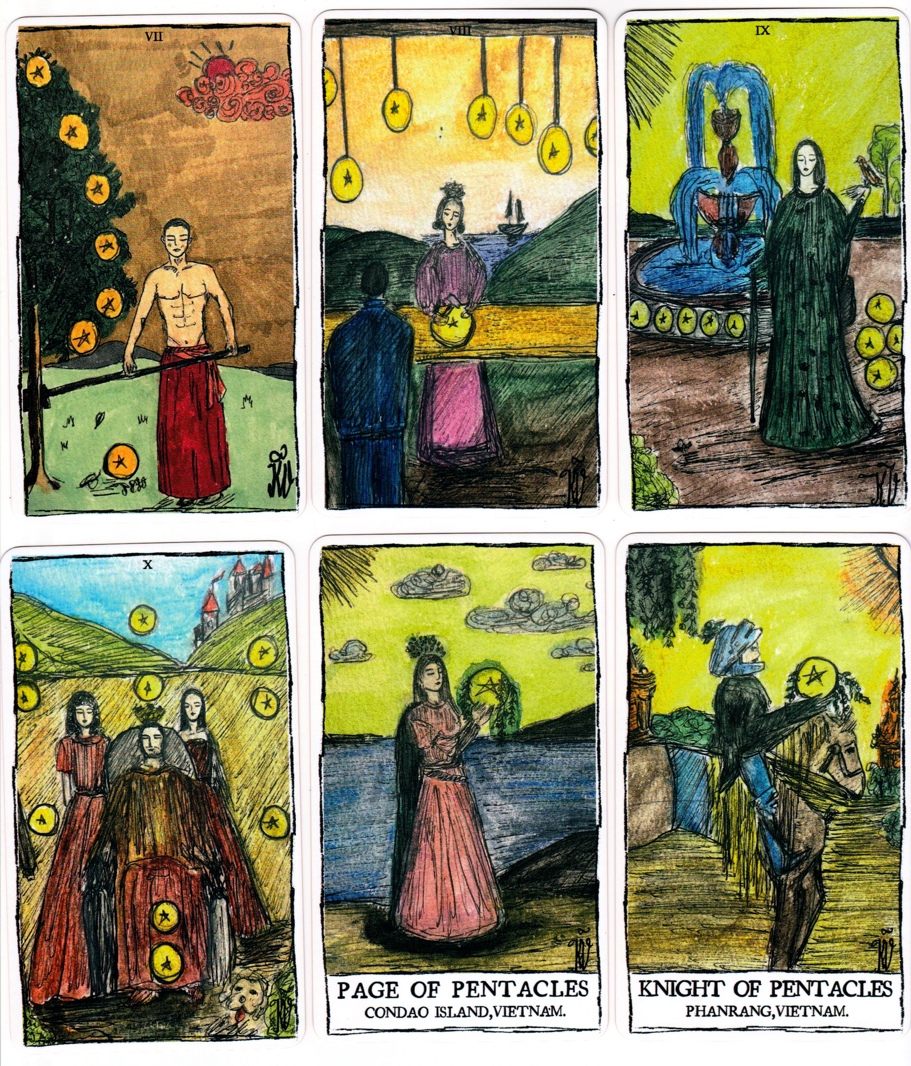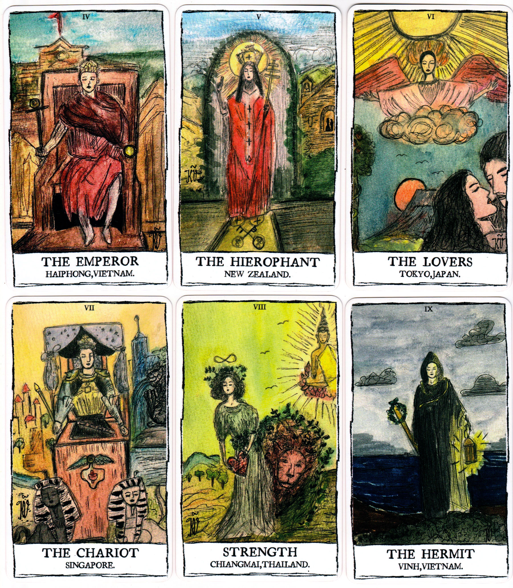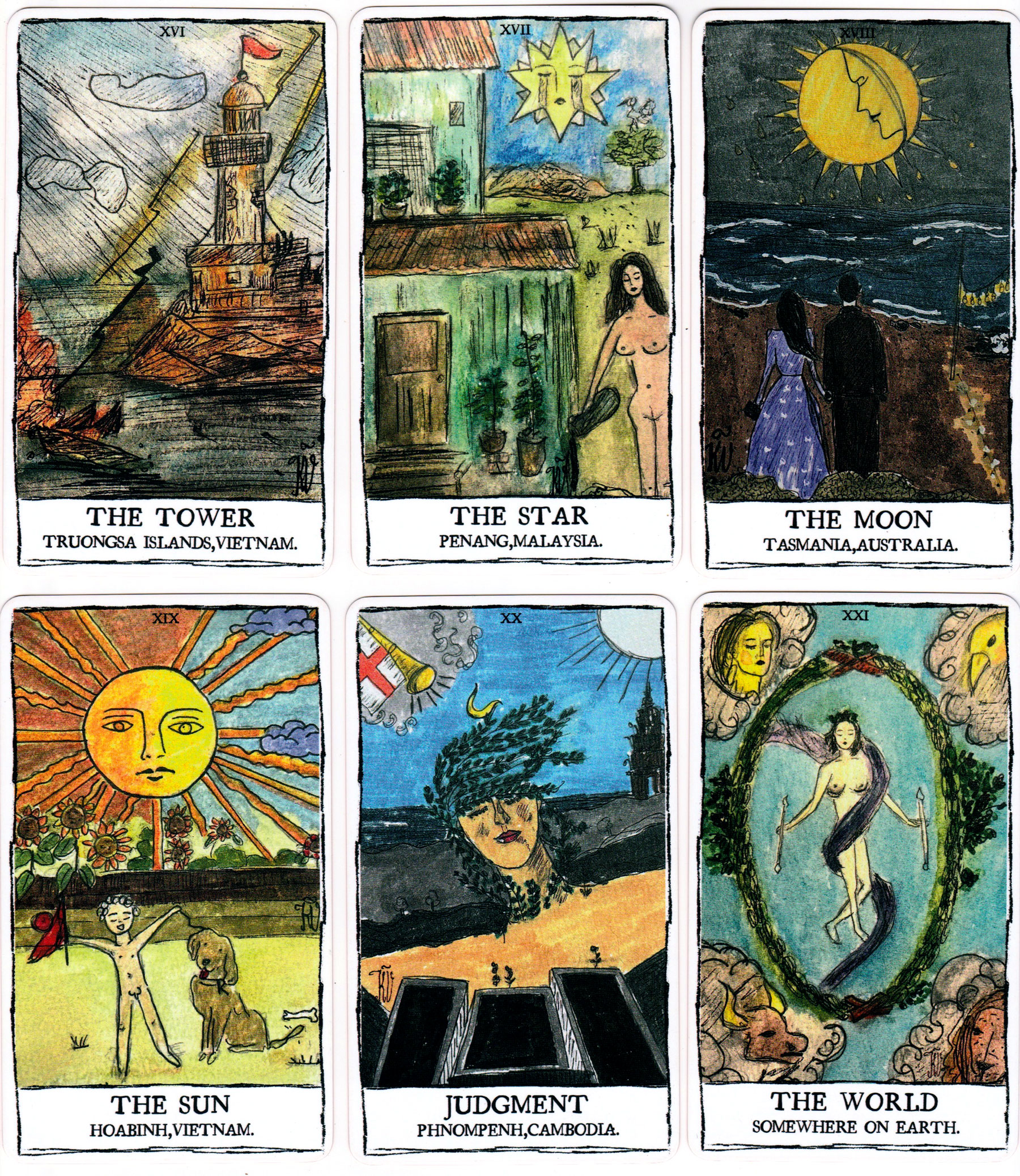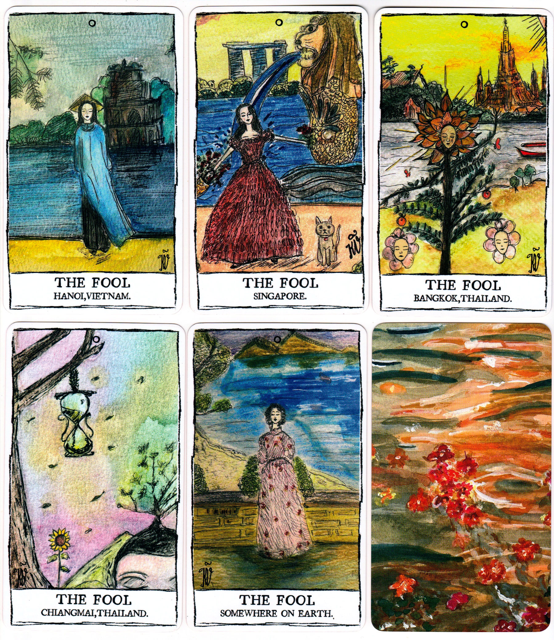 Above: the five Fool cards represent the five elements - Earth, Water, Fire, Air and Soul - also depicting five destinations. The card back was designed by Thuy Vu.