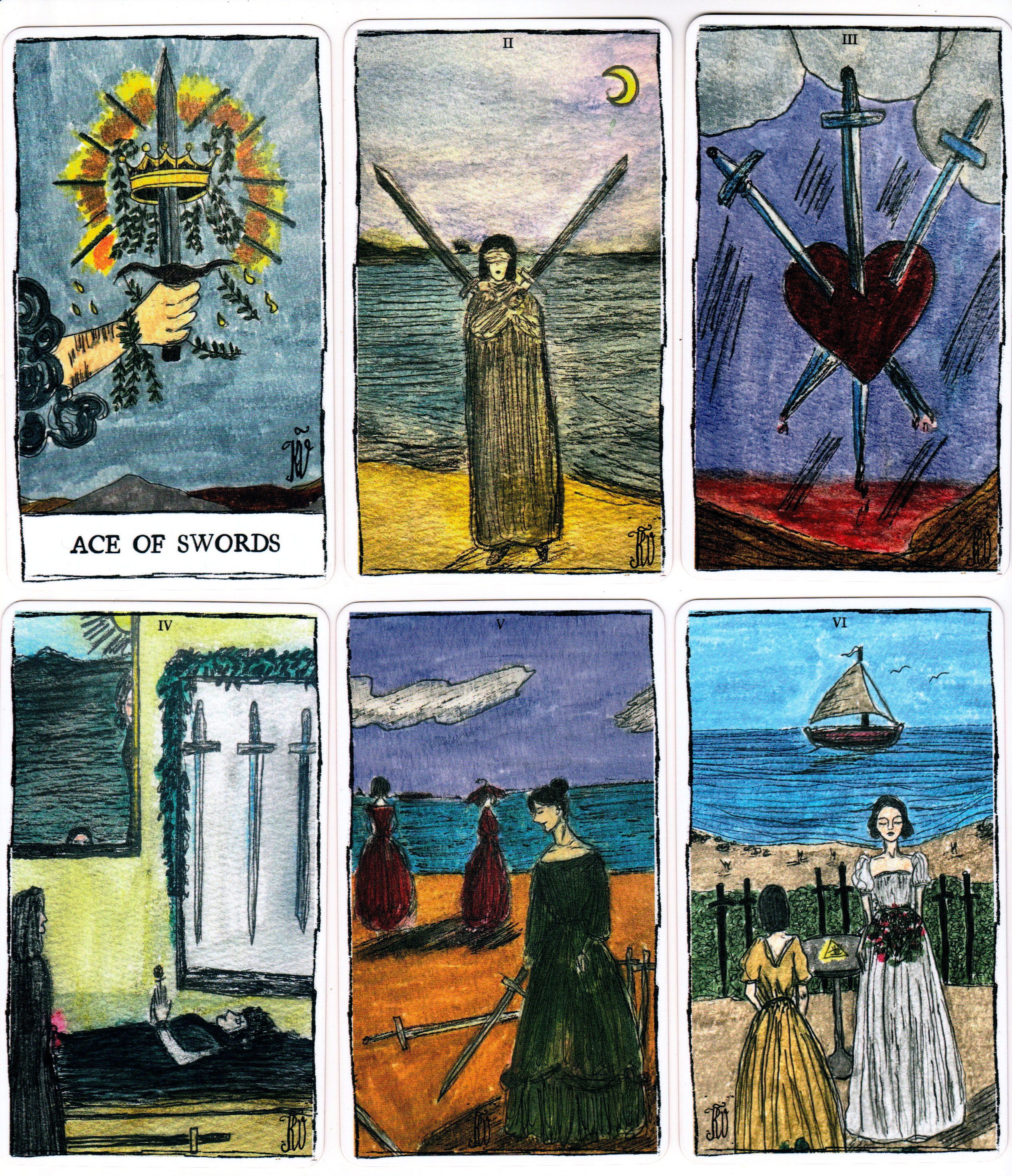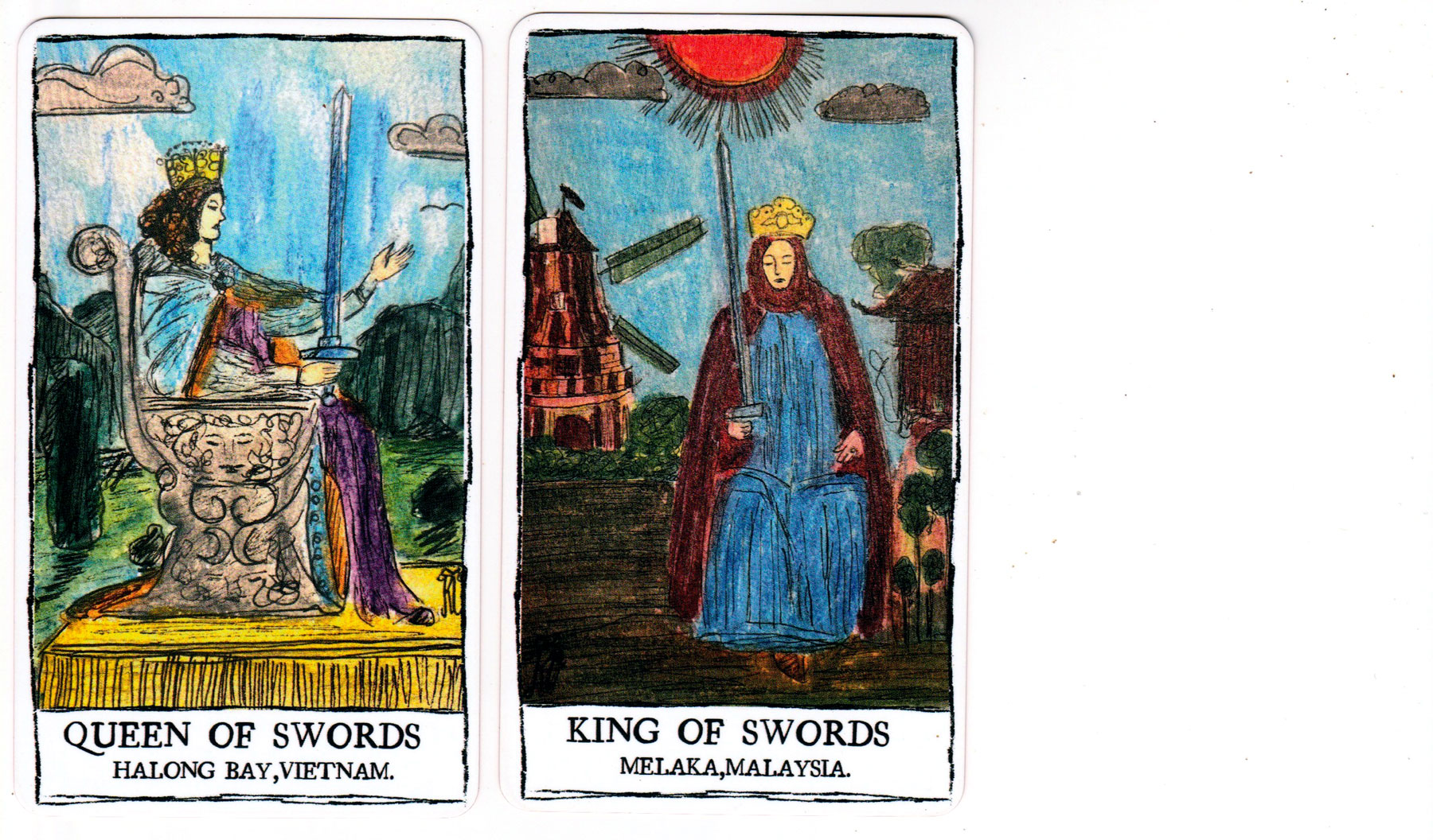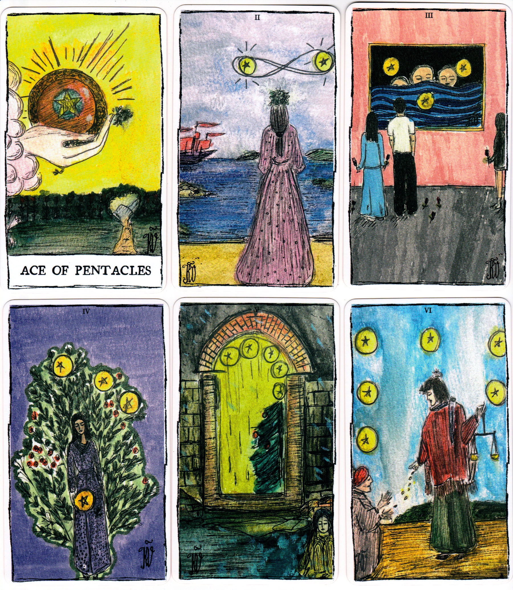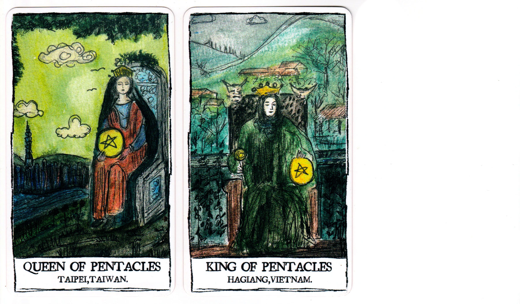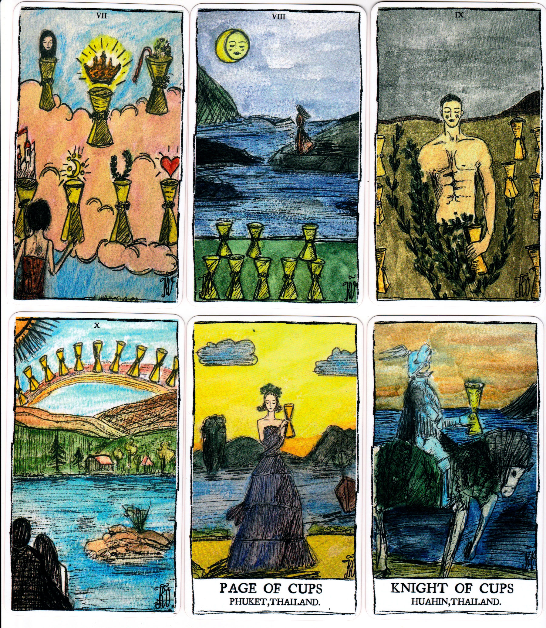 Above: the five Fool cards represent the five elements - Earth, Water, Fire, Air and Soul - also depicting five destinations. The card back was designed by Thuy Vu.