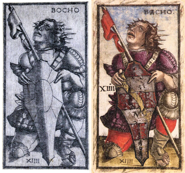 The name “Sola-Busca” derives from two former owners, Count Sola and the Marchese Busca, whose illuminated copy of the deck was acquired by the Pinacoteca di Brera in 2009. Alongside this hand-coloured set, a number of uncoloured impressions also survive, revealing the cards in their engraved state before paint was applied. For example, four court cards are preserved in the British Museum:¹