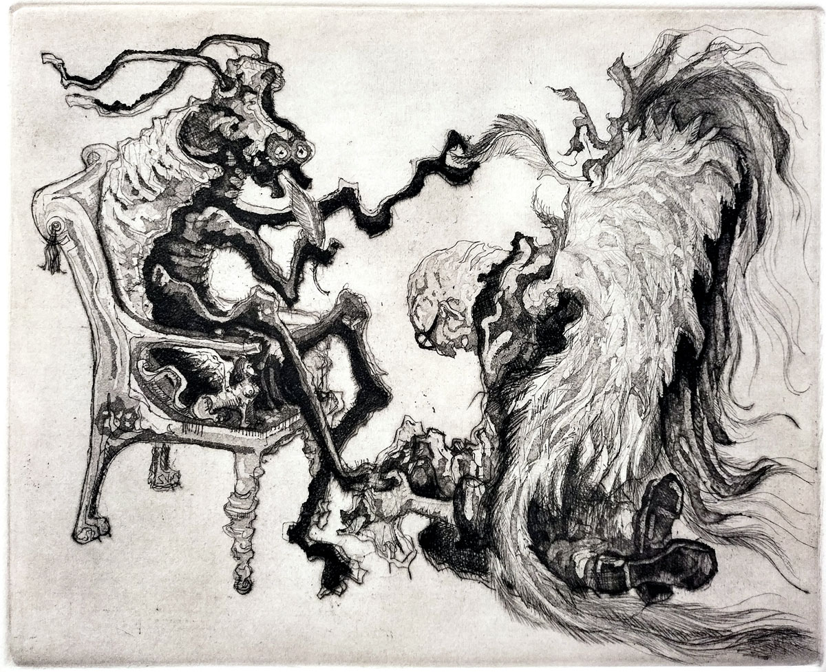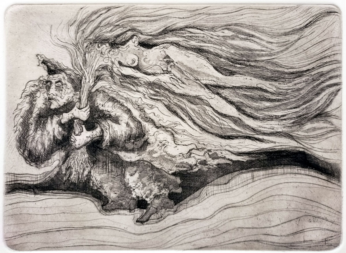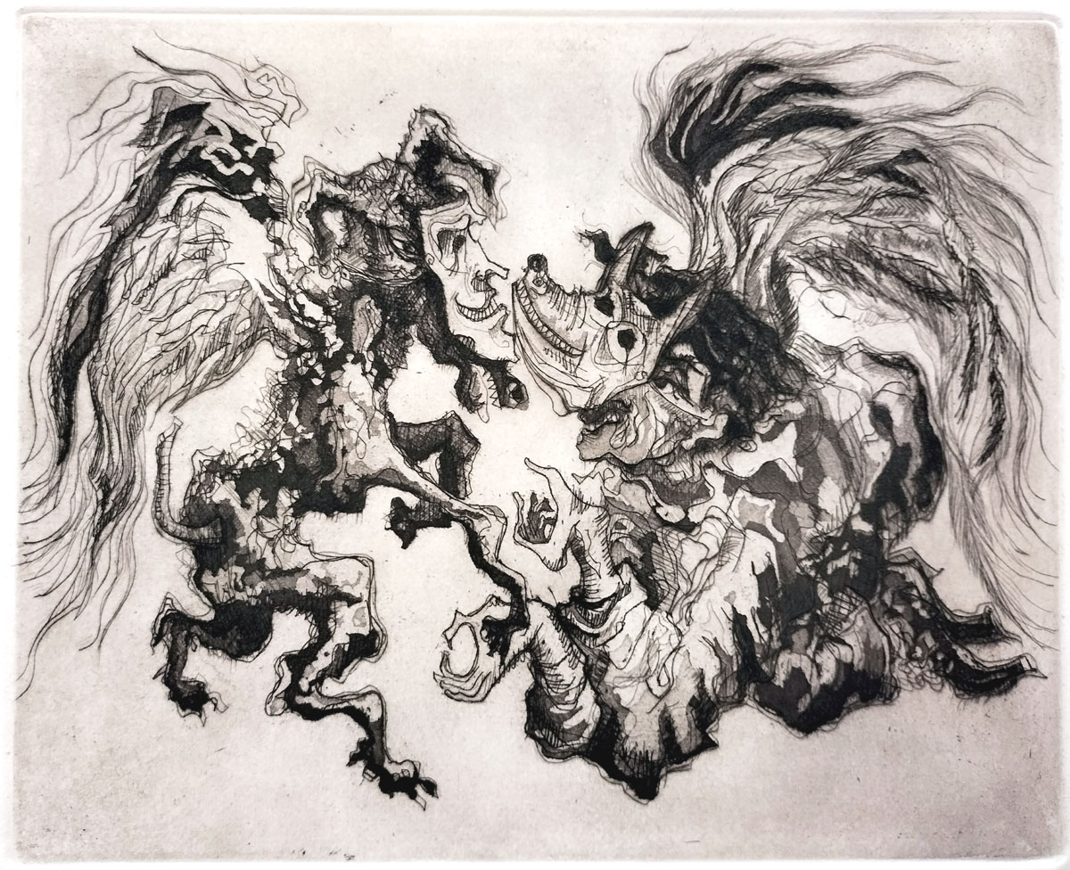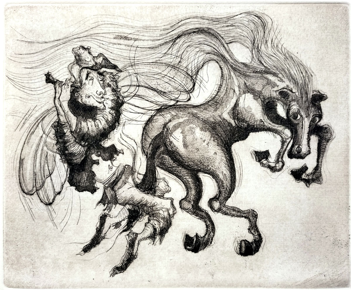 More often titled ‘The Chariot’, Claudio Favier has renamed this Tarot allegory ‘El Viaje’ (The Journey) i.e. a spiritual journey. The horse is surreal and anatomically distorted, with elongated limbs, exaggerated eyes and a flowing mane. Its posture suggests chaotic or uncontrolled instinctual energy. The humanoid figure seems rather disjointed, as though disconnected from reason or instinct, in a freefall between conscious and unconscious forces. The dreamlike, flowing lines convey interaction or psychic entanglement — as though an existential journey of mystical self-awakening is taking place in someone’s mind. Existential doubts may arise regarding the purpose or destination of the journey... a search for meaning when logic says there is none.