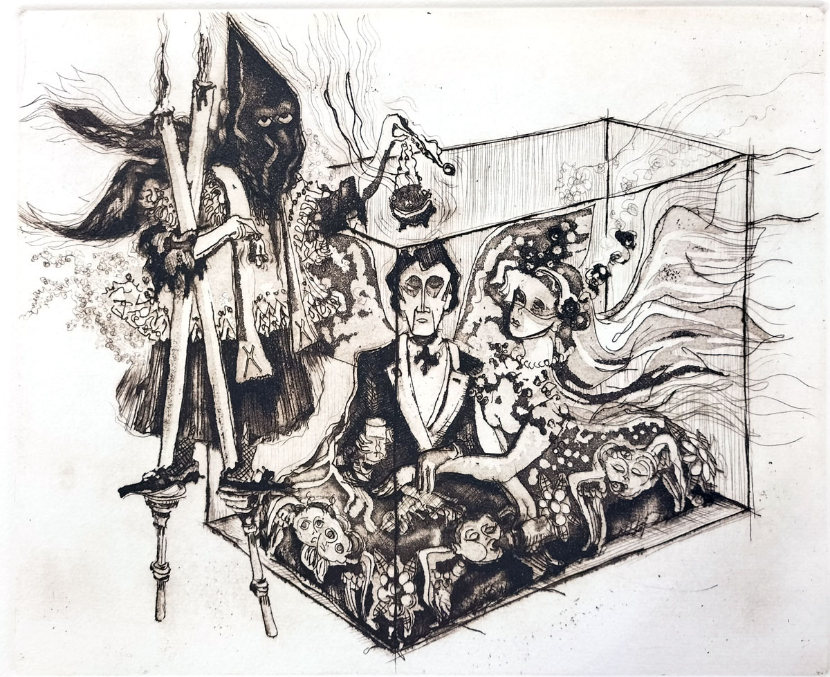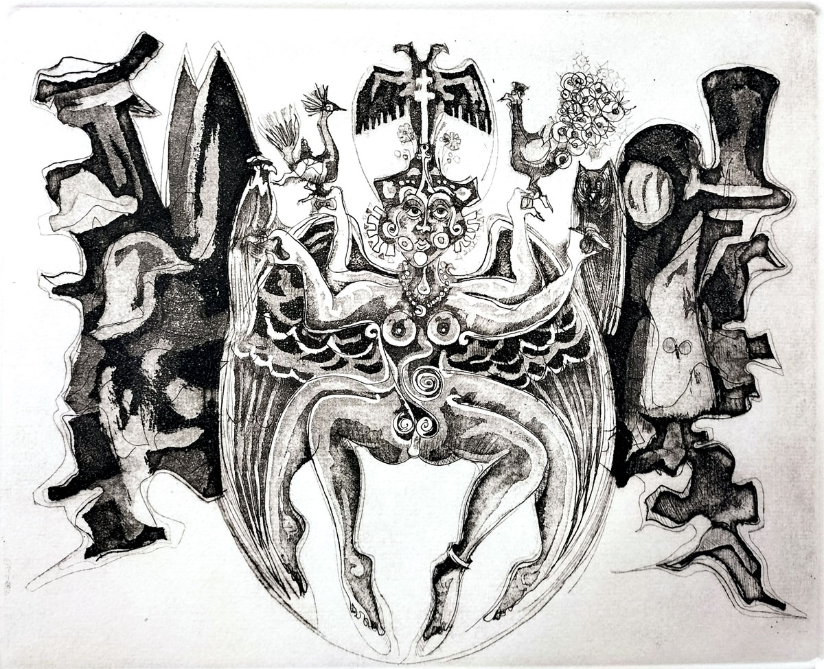 Claudio Favier Orendáin (1931-2008) has reworked traditional Tarot archetypes to reflect the contradictions and psychological complexity of modern life. This is not a fortune-telling game or cartomancy deck, but an exercise in self-exploration, allowing us to understand the paradoxes which we see reflected in world affairs today. His engravings are sharp and intricate, in a surrealist style marked by dreamlike, fantastical imagery with fluid, ambiguous and otherworldly forms. Rich in symbolism, metaphor and philosophical reflection, the etchings explore themes of tradition, authority, knowledge, love, power, imagination and the folly of human pursuits.