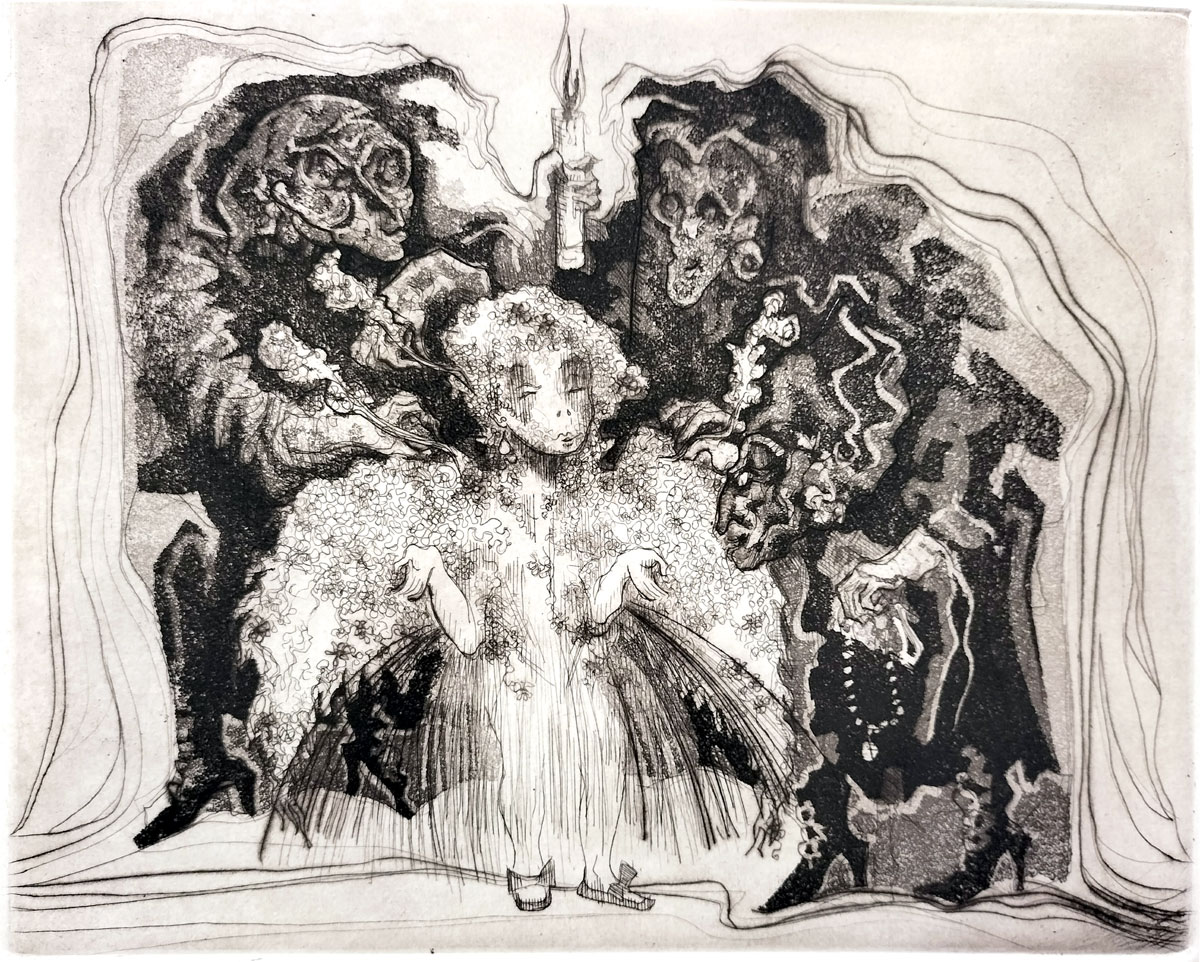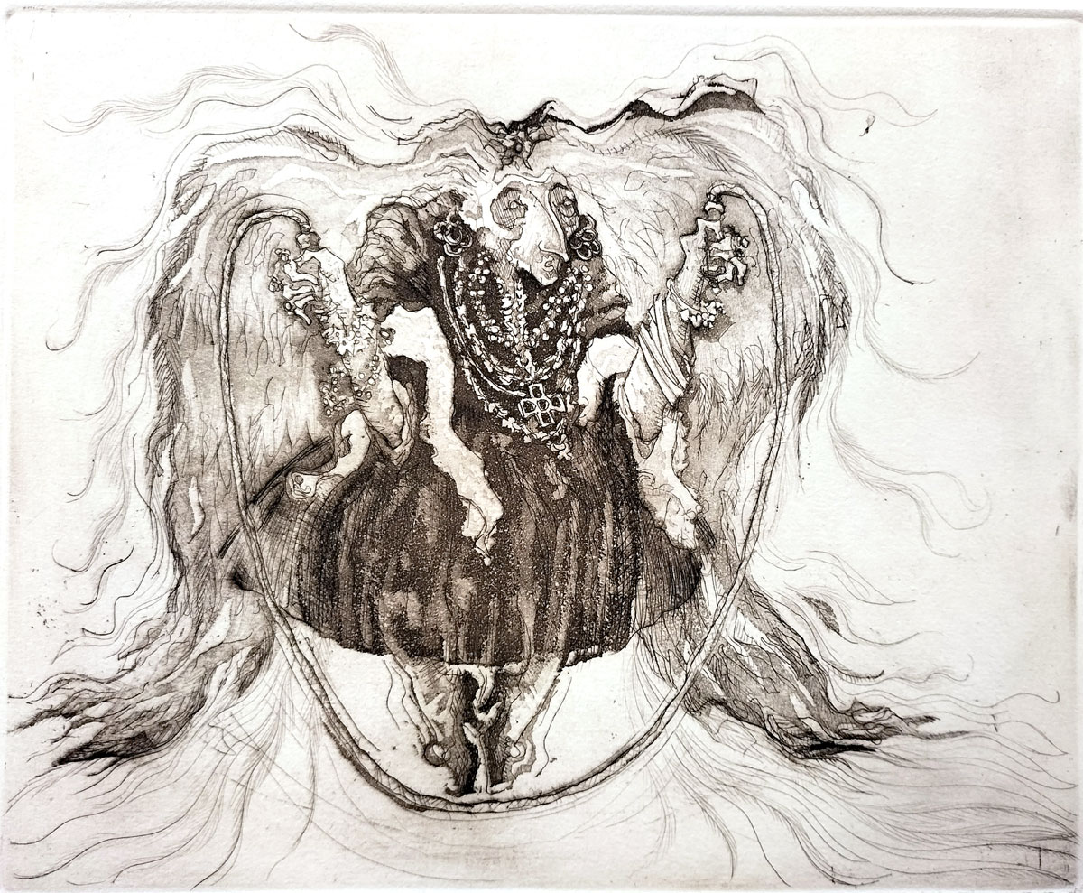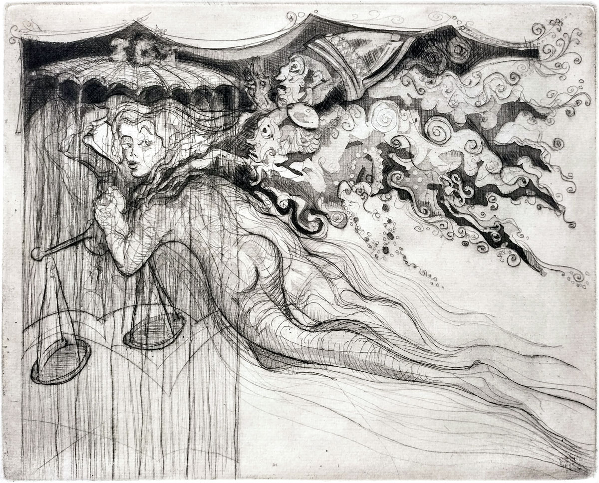 A naked figure of a woman holding scales of justice flies beneath an umbrella. Instead of sitting solemnly with dignity and calm, she is distracted and exposed. Trailing her, beneath a theatrical canopy, is a parade of caricatures and masks, evoking a corrupt or absurd dimension of power and public opinion. The figure wearing a mitre could represent dogma. This satirical representation suggests a system where the ideal is haunted by the grotesque weight of society's contradictions and vested interests. However, the figure of Justice still holds the scales and so the human desire for justice endures even in the context of absurdity and confusion. No single ideology owns justice. The true moral compass still lies with the vulnerable human Justice figure — however burdened she may be.