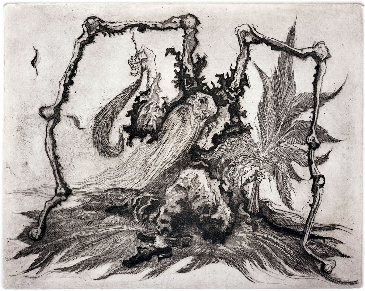 A long-bearded character, representing the hermit wizened by time and solitude, sits on a bed of leaves within a frame of skeletal or decaying bones. His pose is contemplative and hopeful, yet oppressed by black, jagged forms clustered around his head instead of an aura of light: his mind darkened by the rot where light once radiated. In his right hand he offers up a leaf, perhaps an amulet to ward off evil spirits; in his left he clutches a bunch of the leaves. “El Ermitaño” could be seen as a portrait of the modern soul ensnared in the relics of a dying age, reaching for meaning in a materialistic world full of spiritual commodification. In seeking solitude or higher consciousness, the individual is both liberated and consumed — by nature, by time and the haunting echo of mortality itself.