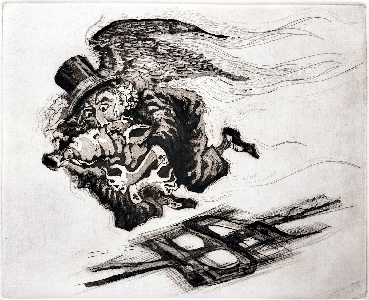 The human face with a top hat evokes old-world capitalism or bourgeoisie representing wealth, corporate elites or power structures. Pigs are traditionally symbols of greed, indulgence or materialism. This hybrid creature may symbolize the absurdity of how wealth or fortune is often rooted in greed and illusion, yet still controls or influences our lives. The addition of wings suggests a surreal or ironic twist — “when pigs fly”. Many people today feel they’re chasing dreams built on unstable foundations, like the skewed and shadowy shape below, driven by financial markets, corporate interests and media illusions of success in the rat race: "modern fortune is a surreal, grotesque beast—part fantasy, part exploitation—and it flies above the real concerns of everyday people."