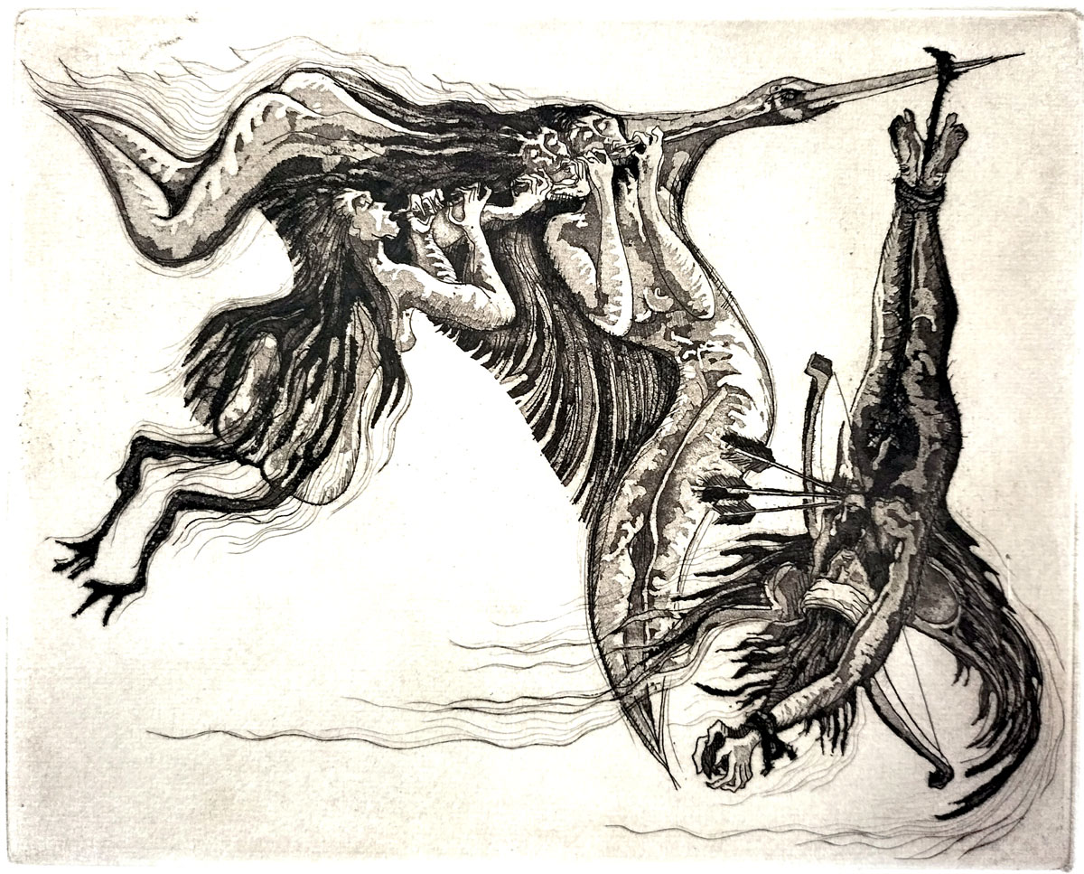 A large bird (possibly a heron or crane) soars upwards while carrying several human-like forms playing flutes or horns, with another figure hanging from its beak, suspended upside-down, pierced with arrows, evoking martyrdom, sacrifice or punishment. The whole scene has a dreamlike, ritualistic air, like a shamanic vision, perhaps a farewell to the sacrificed soul.