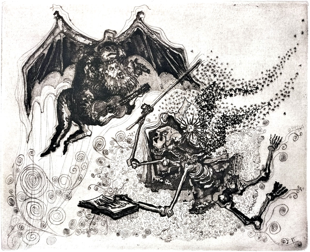A winged, demonic creature clinging to a bearded man playing a guitar hovers above a skeletal figure or ”calaca”, symbolic of death and a happy afterlife. The calaca waves a wand emitting a cloud of magic sparkles, like a swarm of bees forming the shape of wings. He also reads from a book or manuscript, which is a musical score. The three figures are united in a mystical performance. The image alludes to the inevitable presence of death in the face of all worldly pleasures or vices. This is a Mexican theme based on Day of the Dead imagery. The calaca symbolizes a humorous or philosophical take on death, mocking or trivializing it. The winged creature represents the absurdity or spectacle of life serenading death, only to be mocked in return.