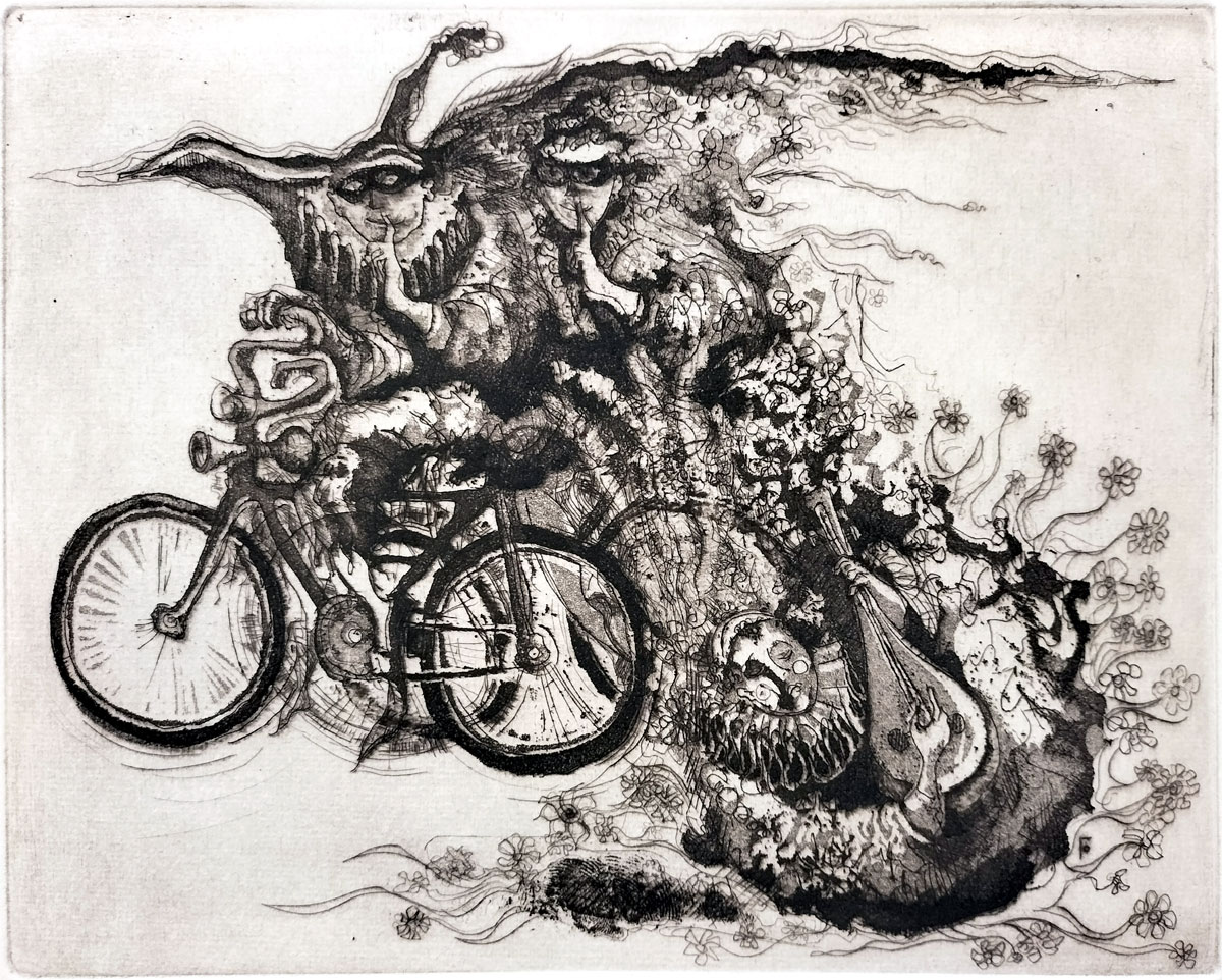 The parody of figures riding a bicycle suggests that identity in life consists of multiple roles, emotions, personas and subconscious drives pursuing “freedom” and illumination. This satirises the psychological complexity of the modern individual trying to steer through life carrying an overgrown, chaotic internal world of dreams and desires. This is not just a celebration of innocent joy and freedom, but unresolved inner contradiction. The bicycle, flowers and music evoke freedom — but they’re tangled within a complex, shadowy internal landscape. The message might be: “rather than escaping from chaos and seeking fun, better to confront and integrate the full spectrum of contradictory forces within and seek to know yourself.”