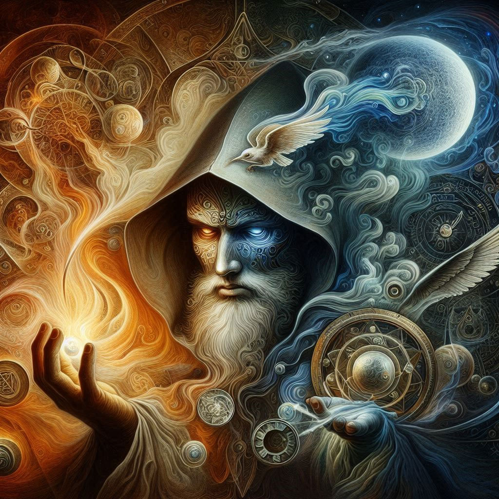 In adventure stories or fantasy movies magic often serves as a means to challenge perceptions and uncover life's deeper mysteries. The Illusionist, or Magician, is shown here in an introspective act of unmasking the artificiality of the conventional status quo which hides the tragic suffering in the world. The surreal image, full of emotional power, depicts two grotesque figures wearing masks, engaged in a theatrical struggle with their own inner demons. The chaotic energy suggests the Illusionist may be caught in his own alchemy, seeking to dispel illusion and overcome duality as though by magic - a critique of the performative roles we play and the absurdity of self-deception. This opens the door for profound inner growth, healing and authenticity by exposing the trickery of perception itself and how we deceive ourselves with delusions. Our identity, or "presentation of self in everyday life," can become a curated performance.