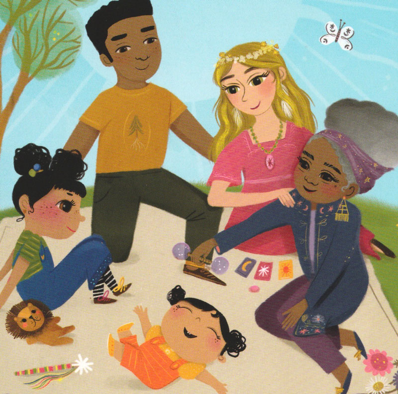 Above: artwork from the World card depicts a vibrant outdoor picnic scene where a diverse family gather, and the mother performs a tarot reading.