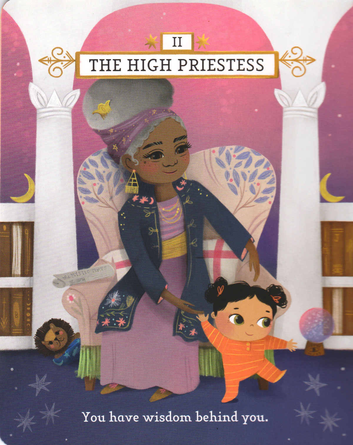 Above: the High Priestess features a wise grandmother and a playful baby among mystical symbols and books, with the caption: "You have wisdom behind you."