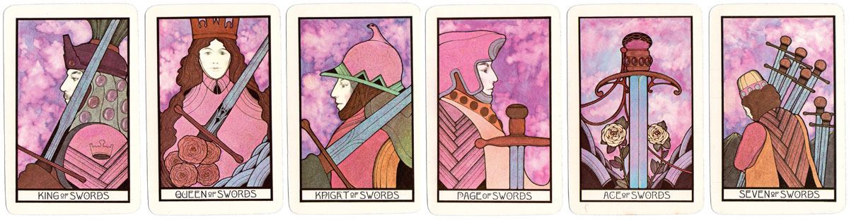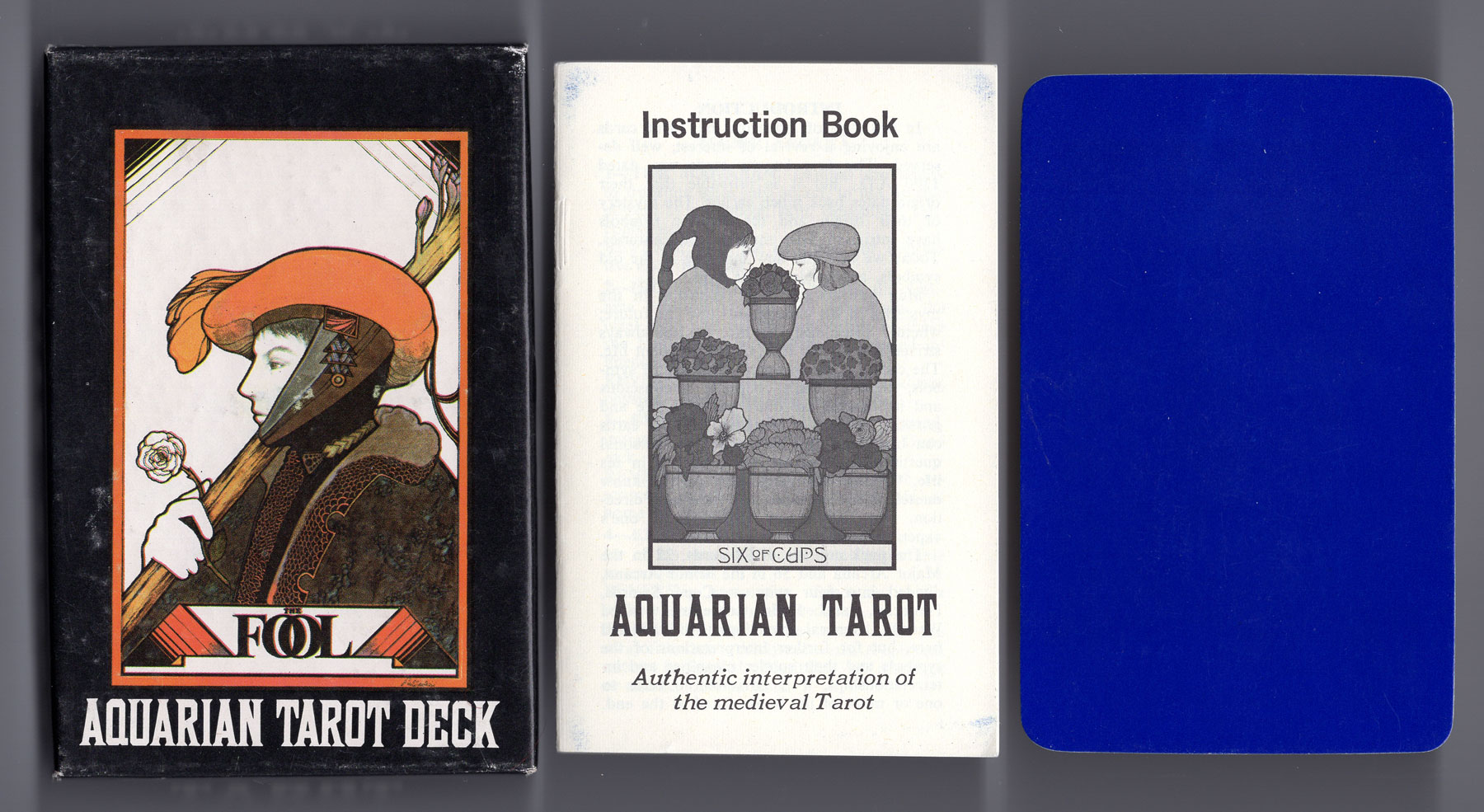 The Aquarian Tarot Deck is the second tarot project by artist and illustrator David Palladini (April 1, 1946 – March 13, 2019), and is a full 78 card deck published by Morgan Press, Inc., in 1970. It became extremely popular, riding on the wave of interest in all things esoteric that came with the dawning of the new Age of Aquarius, and has remained in print ever since. The cards are a lush mix of Art Deco and Art Nouveau styles, and follow the Golden Dawn order for the trumps, i.e. Strength is at VIII and Justice at XI, while the minor cards echo Pamela Colman Smith's illustrations from the ubiquitous Rider Waite Smith deck.