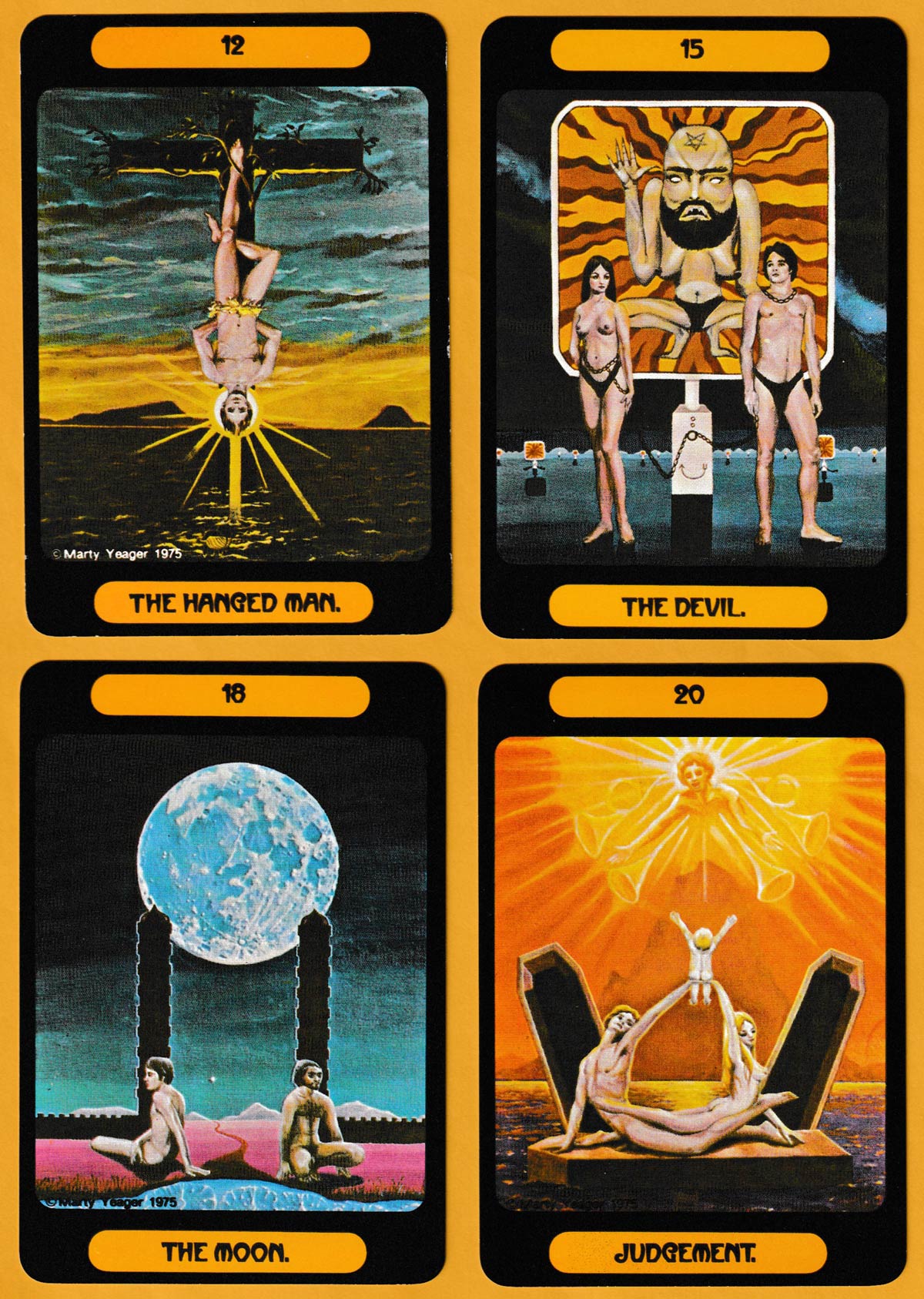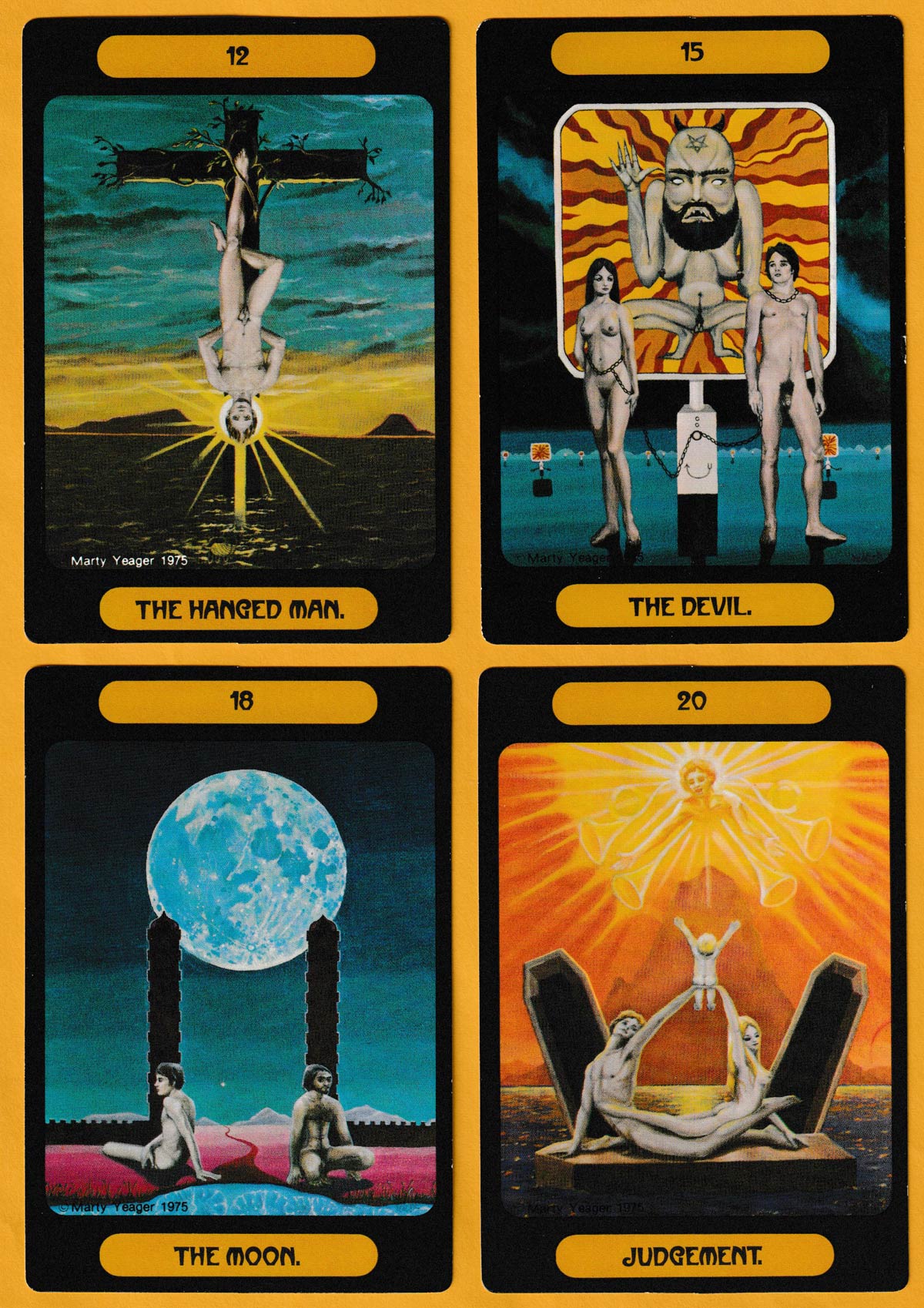 The notoriety of the Yeager Tarot stems from the fact that there was a considerable amount of nudity in the first edition (1975). The artist Marty Yeager (1945-1991) had studied many sources before creating his own images which incorporate elements of Buddhism, Hunduism and Christianity. Before the more commercial edition could be published (1982), Stuart Kaplan of U.S. Games Systems asked for some of the images to be ‘cleaned up’. Thus it was that cards 0, 1, 6, 10, 12 and 15 of the major arcana had fig leaves and underwear added to the figures for modesty. Curiously, however, female breasts were not subject to this treatment and even some genitalia were missed (see 18)!