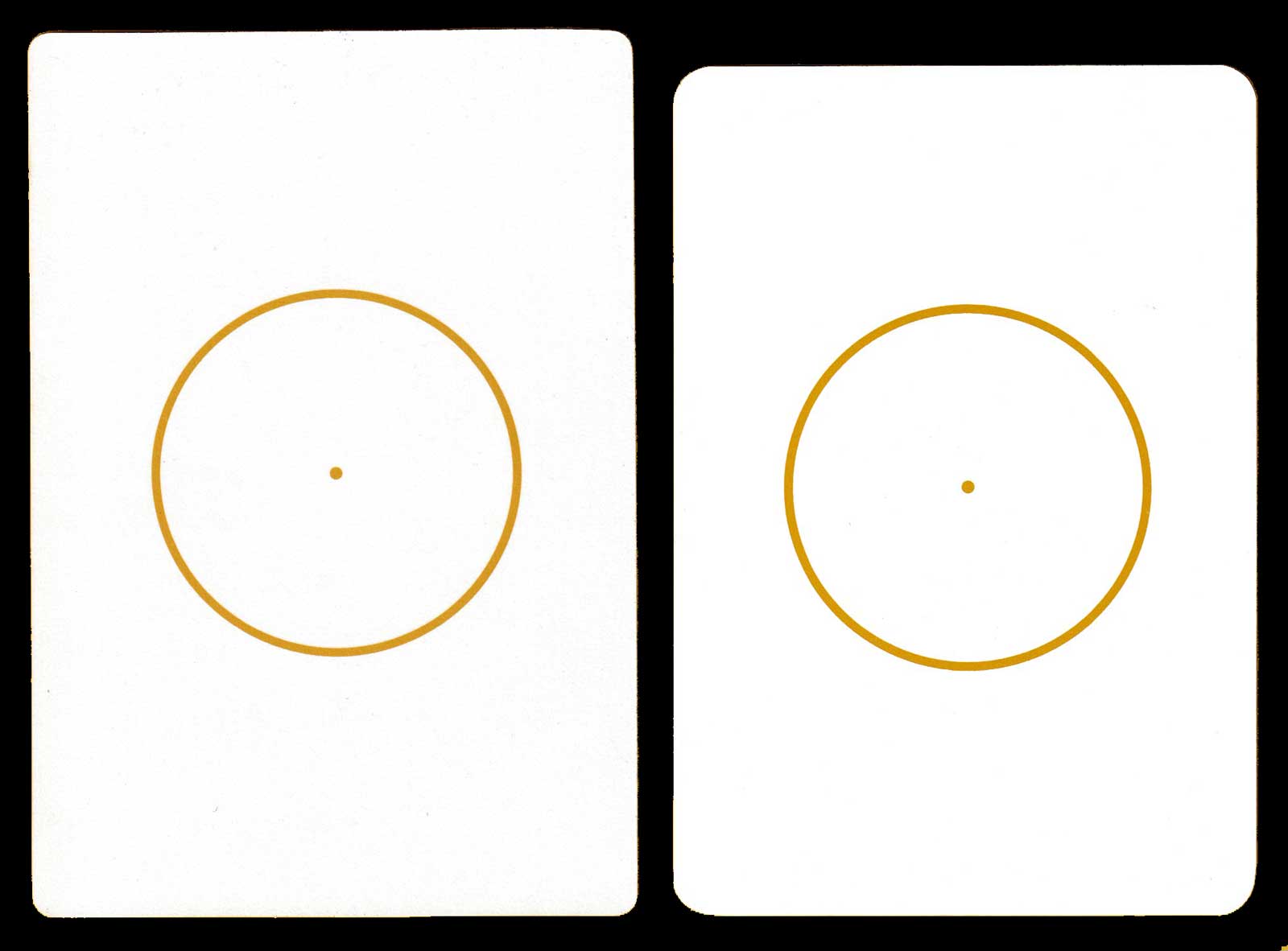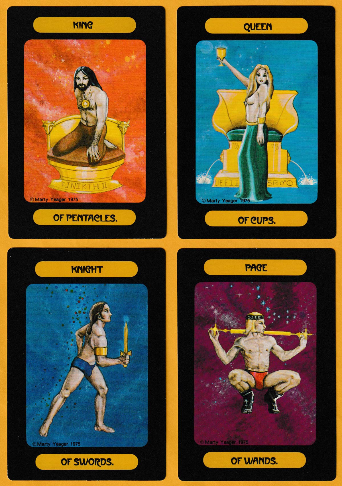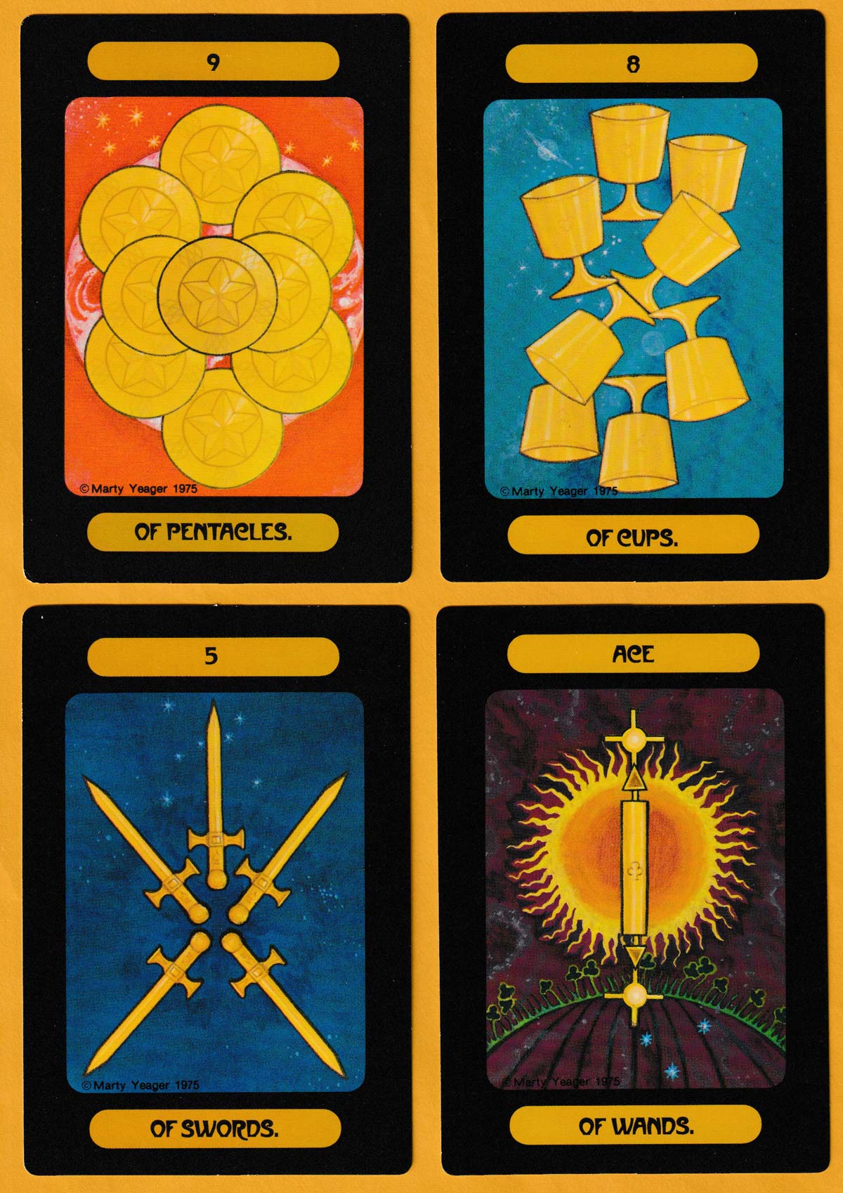 Marty Yeager was known for painting landscapes and background scenes for films. It could be argued that those elements are more successful in his designs than the human figures. The minor arcana are quite plain. All the cards have black borders, while the backs are plain white with a gold spot in the centre of a ring of gold. Every card in each edition carries the mention “© Marty Yeager 1975” in black or white in the bottom left-hand corner.