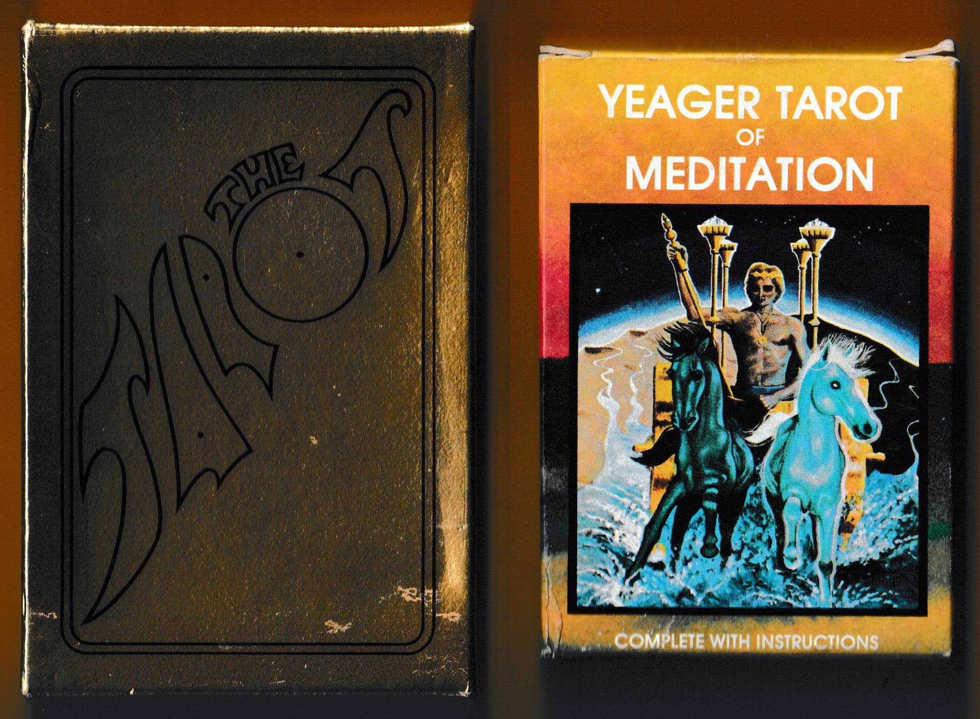 Above: Tarot of Meditation by Marty Yeager, published by Credo Company, Laguna Beach, CA, USA. 78 cards + 32-page booklet in gold drop-lid box inscribed “The Tarot” in black. Size: 78 x 114 mm. © Marty Yeager 1975