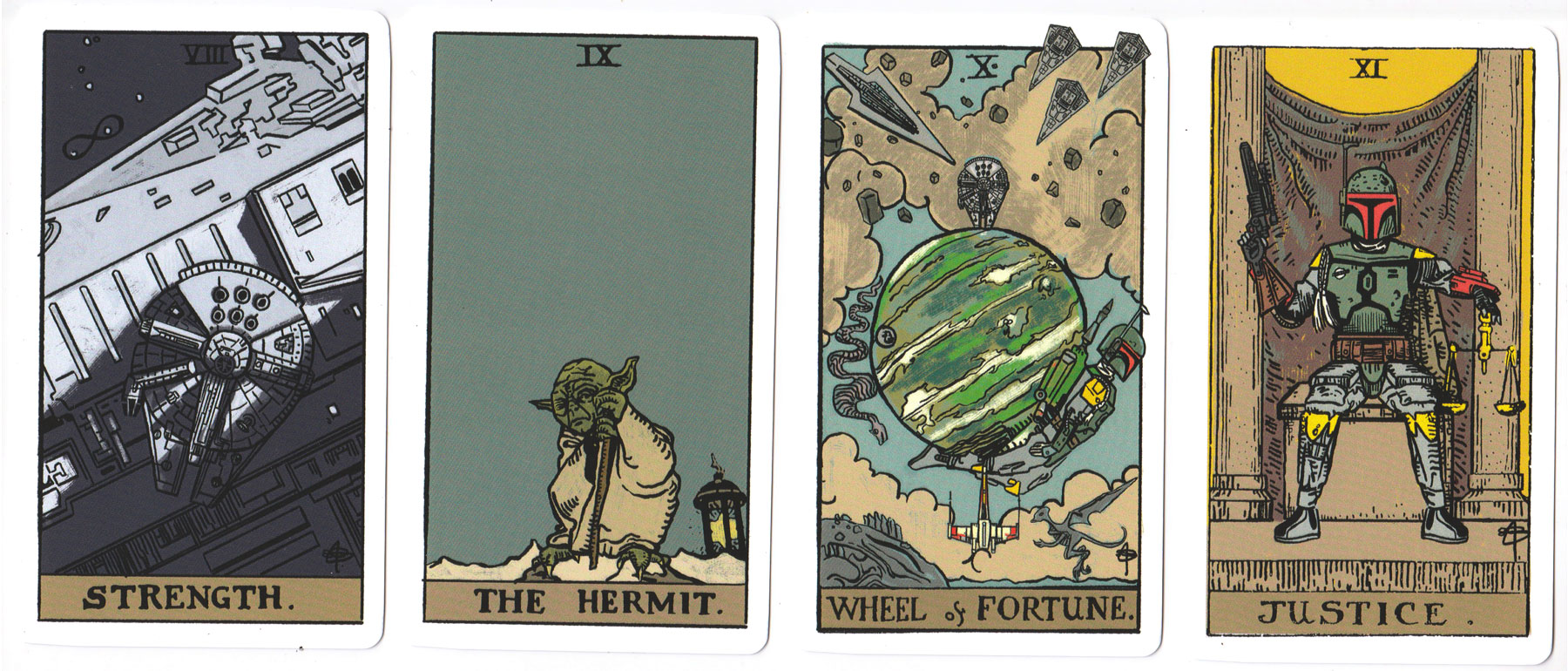 Above: The Tarot Strikes Back deck pairs Star Wars imagery with tarot cards: Strength with a Star Destroyer, The Hermit as Yoda, The Wheel of Fortune with Dagobah, and Justice as Boba Fett.