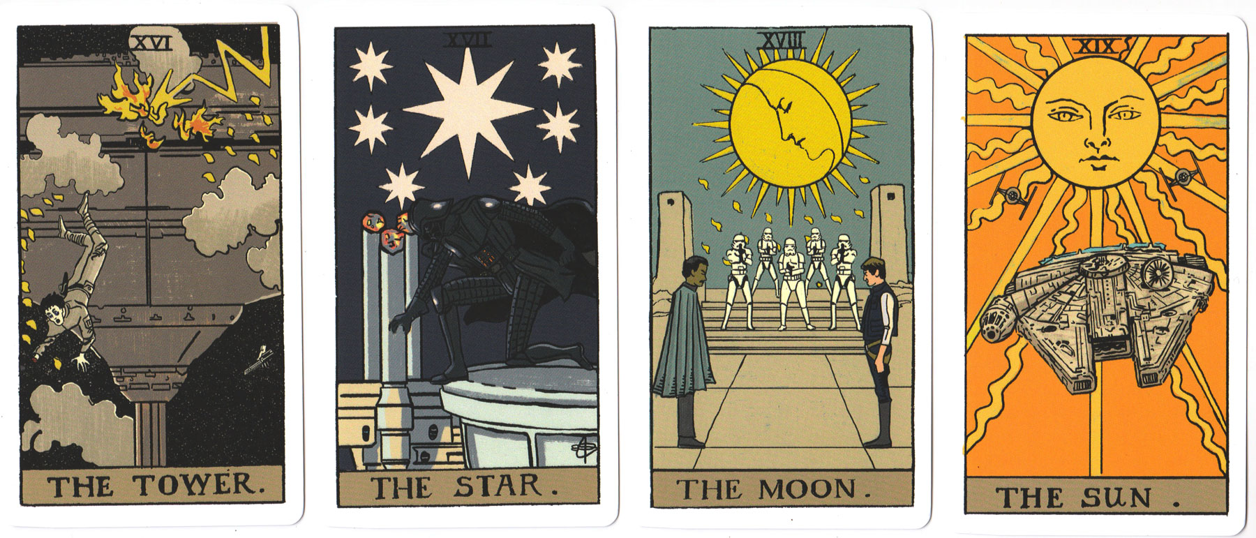 Above: The Tarot Strikes Back deck interprets The Tower with the Death Star's explosion, The Star with Darth Vader and Luke's reflection, a confrontation on The Moon card, and The Sun card with the Millennium Falcon.