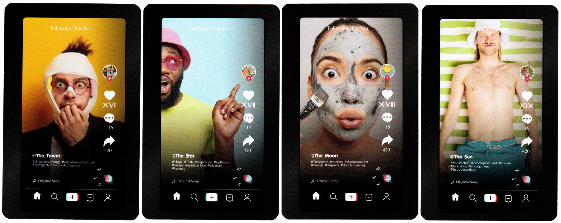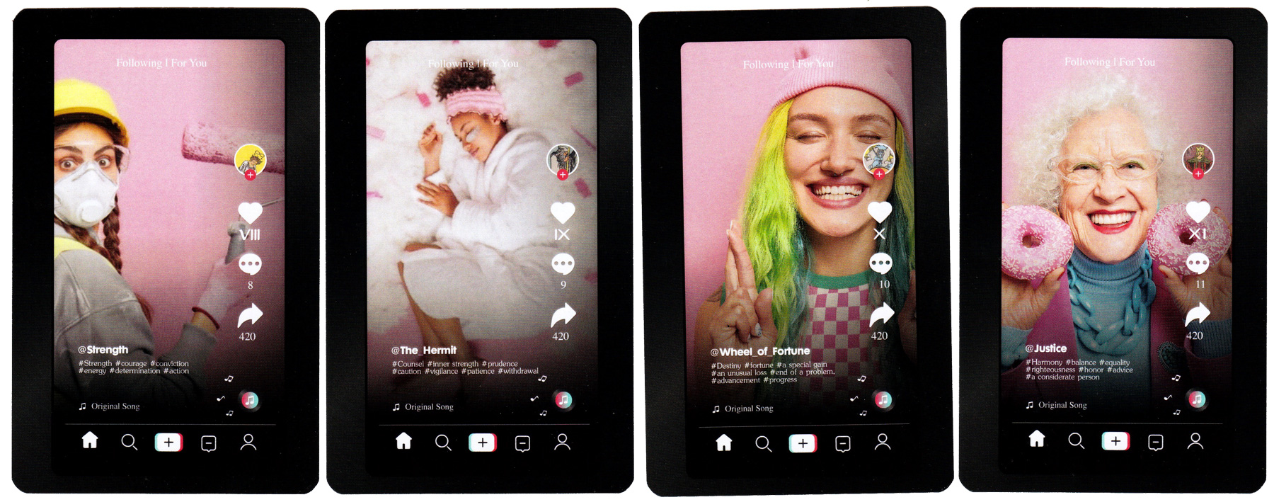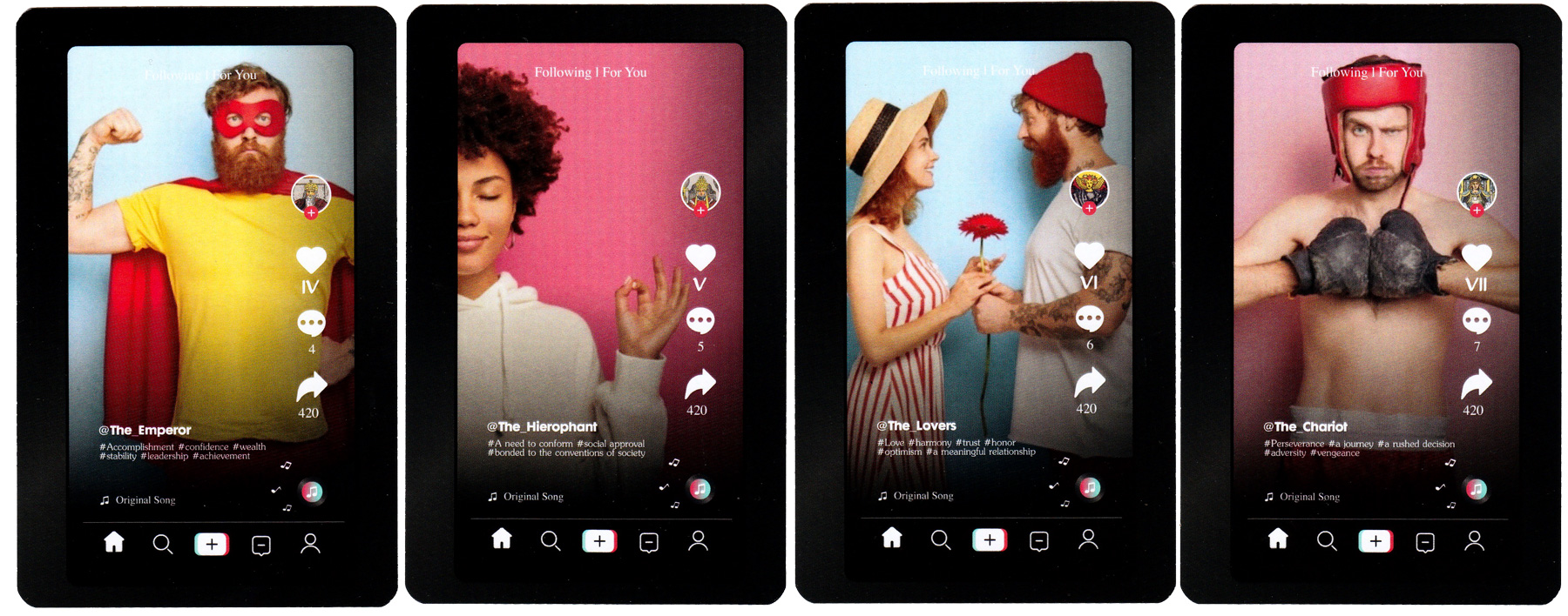 The standout features of this deck is its unique design, which aims to mimic the user interface (UI) of the TikTok mobile app. Each card is designed to look like a screenshot, with photography of people representing interpretations of the Rider-Waite deck. This clever use of TikTok-inspired imagery helps to make the deck more modern and relevant to today's younger generation and appeal to the modern mystic lifestyle.