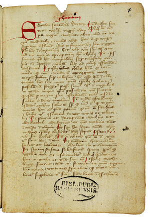 - Basel, Universitätsbibliothek, F IV 43, f. 1r – Johannes von Rheinfelden, Tractatus de moribus et disciplina humanae conversationis: id est ludus cartularum moralisatus