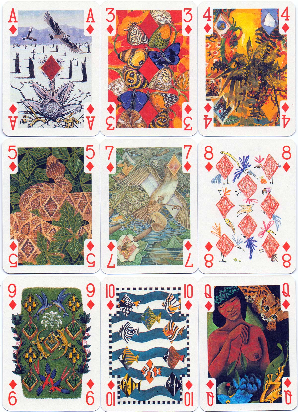 Above: “Art for the Earth” Transformation Deck published by Andrew Jones Art for Friends of the Earth, 1992. 52 cards + 2 Jokers + 1 extra card + leaflet in a tuck box, printed by Carta Mundi. Each card has been transformed by a different artist / illustrator.