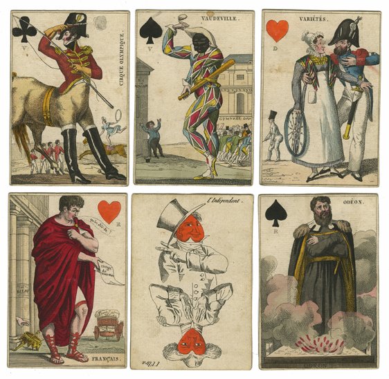 This deck has 52 etched and hand-coloured cards with full-length court cards featuring satirical caricatures of political figures then in the ascendant. For example, the knave of spades features the politician and historian Vicomte de Chateaubriand dressed in clerical costume (see caption below). A second set of court cards was published relating to the major theatres in Paris but having the same number cards.