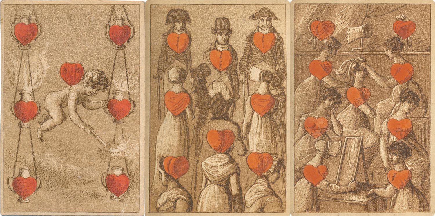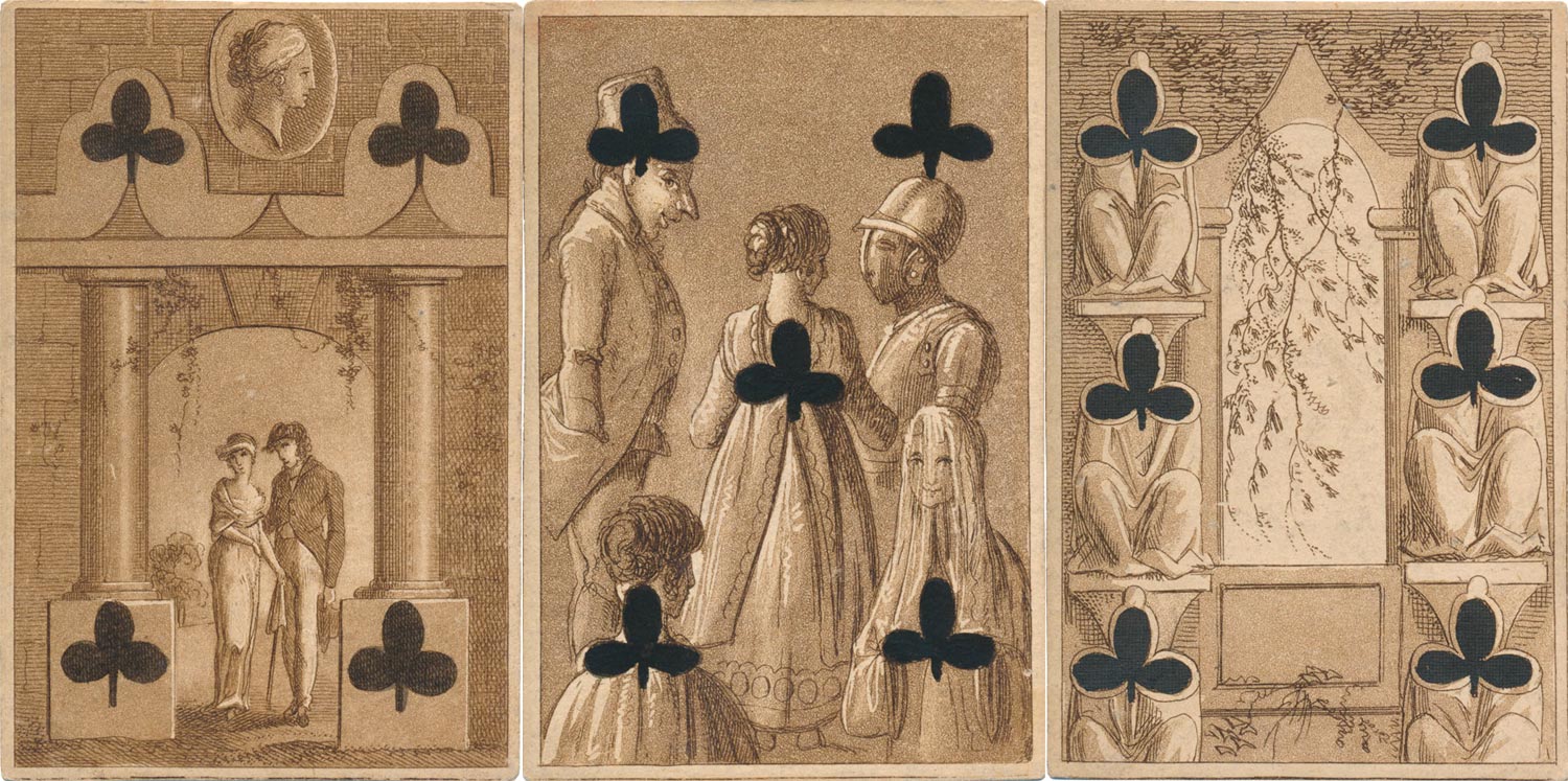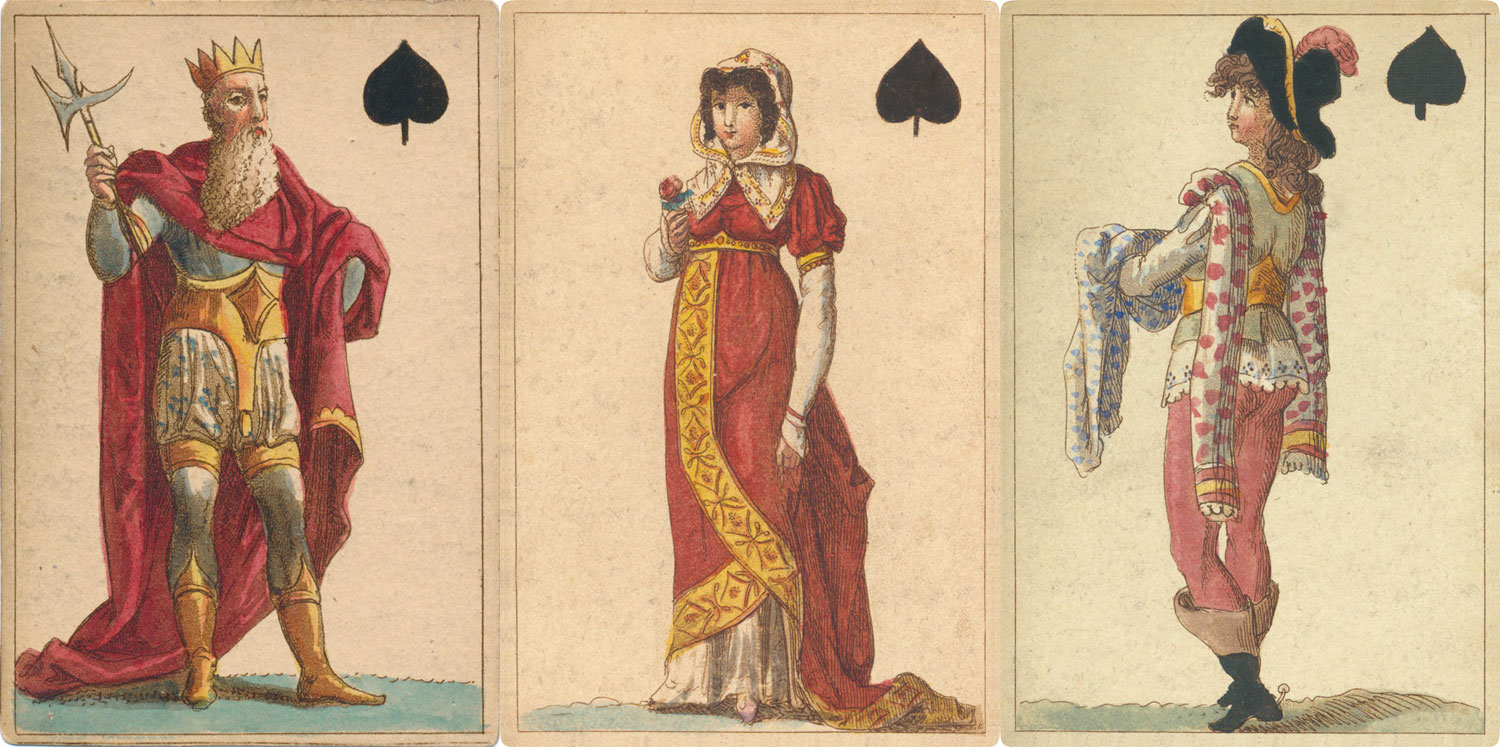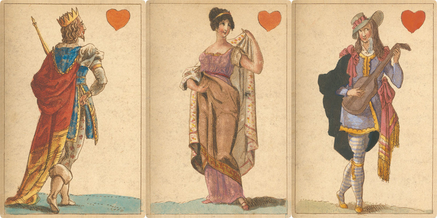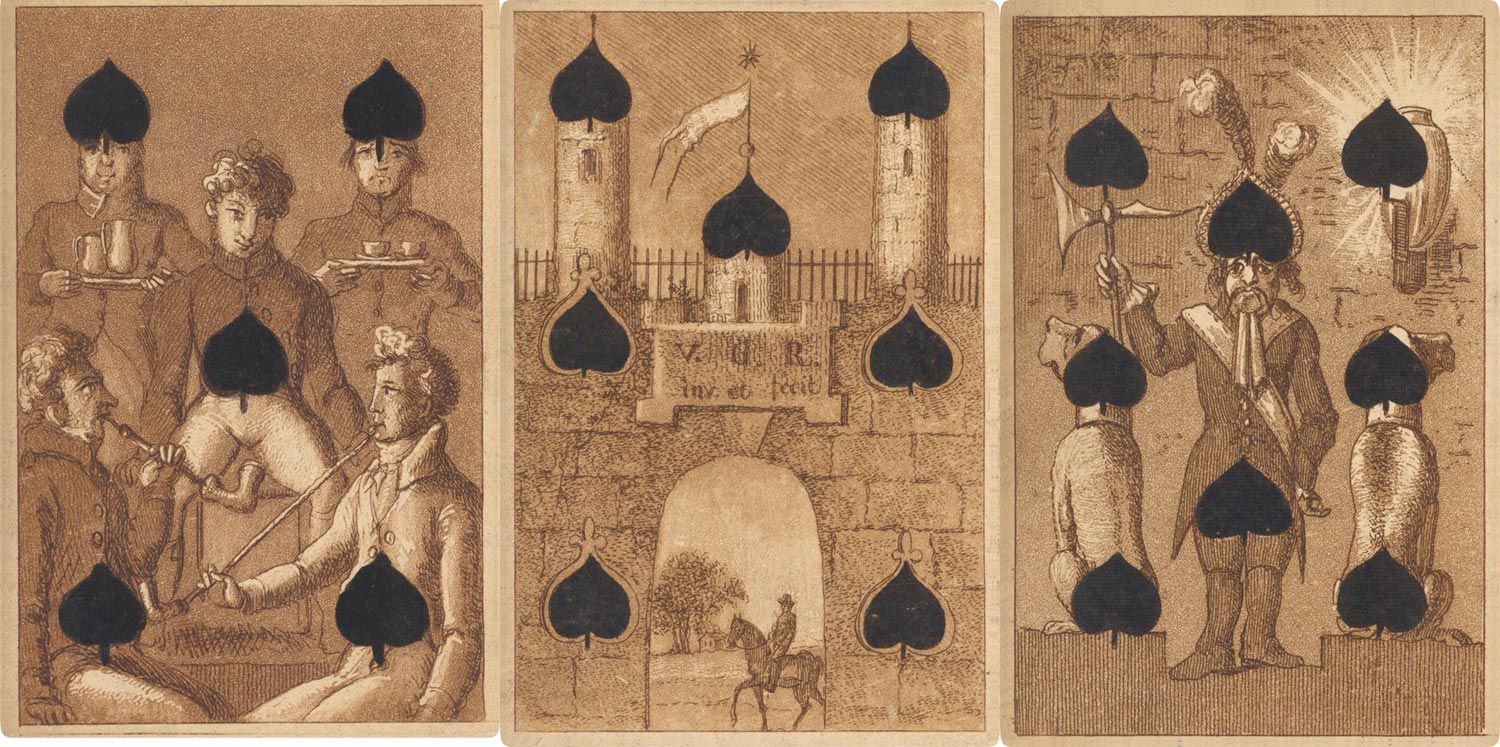 Vienna, 1809, artist-illustrator Vincenz Raimund Grüner (1771–1832) published Kartenalmanach auf Jahr 1810 containing 52 drawings fashioned into a pack of playing cards. The court cards are highly skilled miniature paintings and the hand-colouring exceptionally well done. The transformation of the pip cards is elegant and sensitive. The artist’s monogram, “V.G.R.” appears on the 7 of Spades with the notice “inv.et fecit” showing that he both designed the cards and executed the etchings.