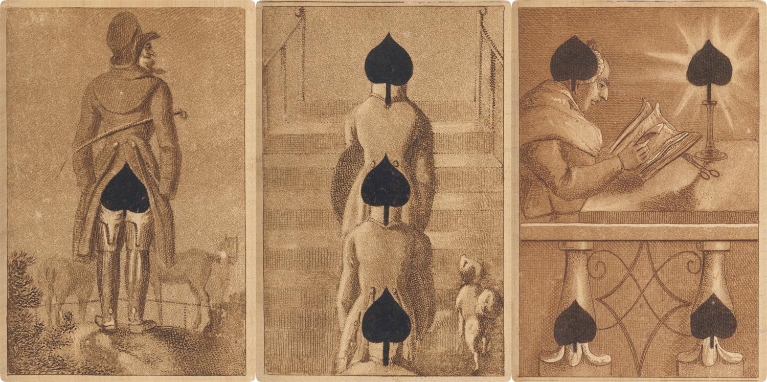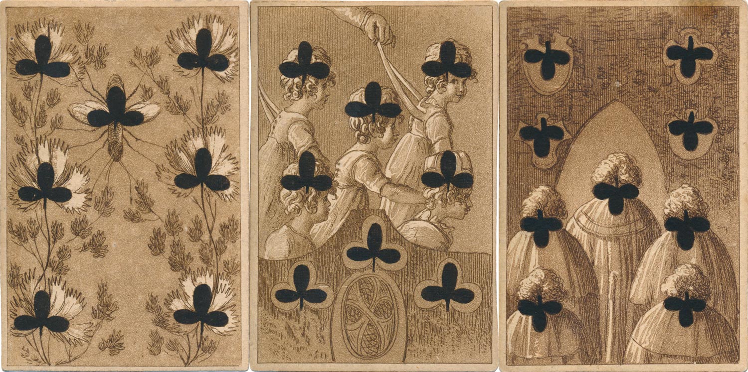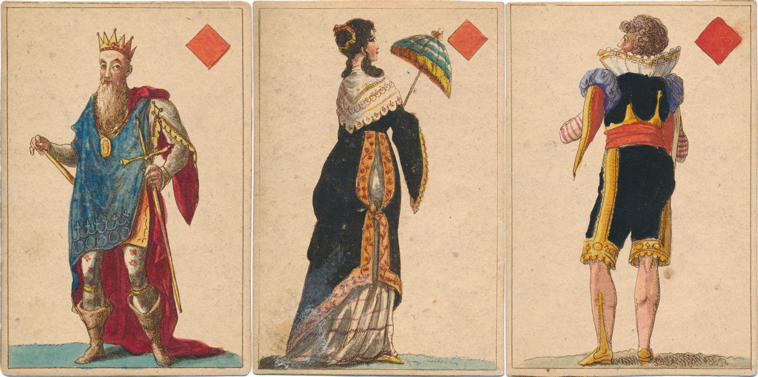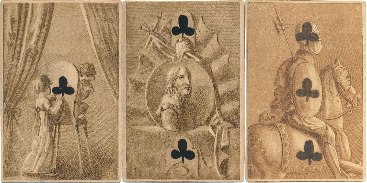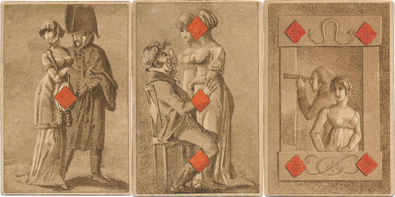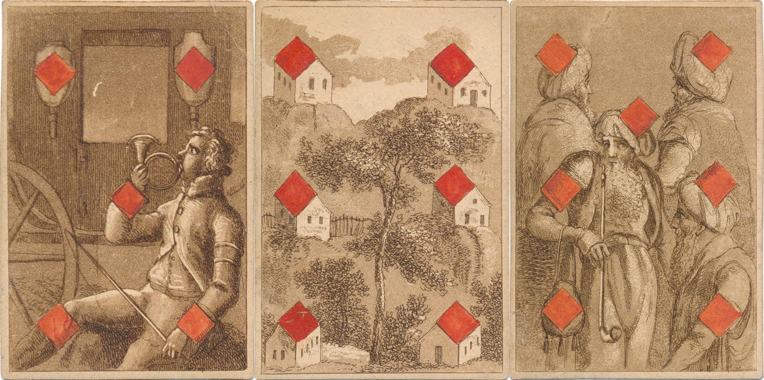 Vienna, 1809, artist-illustrator Vincenz Raimund Grüner (1771–1832) published Kartenalmanach auf Jahr 1810 containing 52 drawings fashioned into a pack of playing cards. The court cards are highly skilled miniature paintings and the hand-colouring exceptionally well done. The transformation of the pip cards is elegant and sensitive. The artist’s monogram, “V.G.R.” appears on the 7 of Spades with the notice “inv.et fecit” showing that he both designed the cards and executed the etchings.