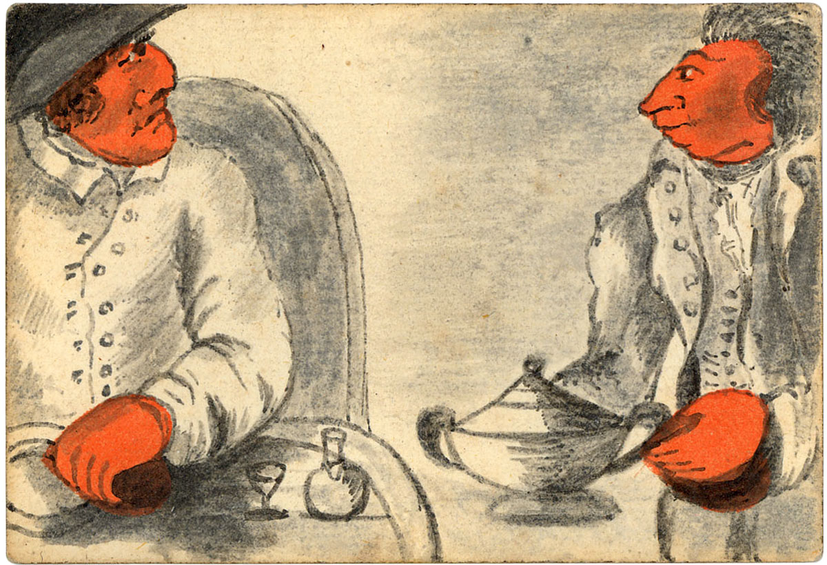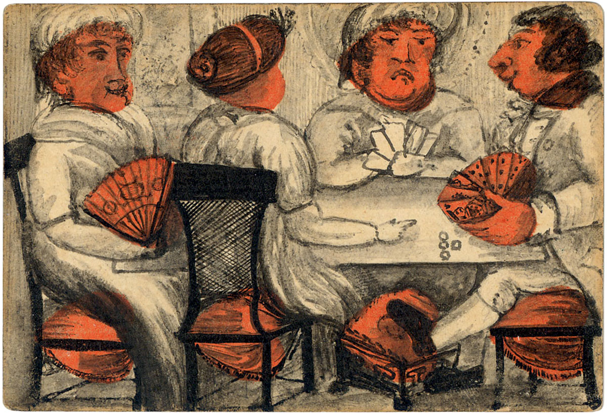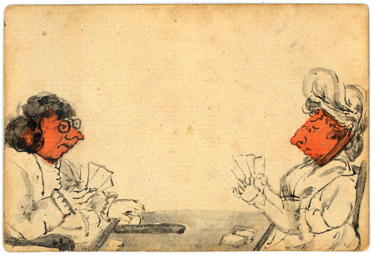 The cards are hand-painted and coloured, some on standard printed cards, artfully incorporating the suit symbols into the images depicting contemporary scenes in late Georgian society. We see folks snoozing by the fireside, smoking pipes, enjoying a musical ensemble, playing card games and a variety of other everyday scenes. In short, a candid documentary glimpse of bourgeois domestic life and manners without pomposity. There is a fascinating range of facial expressions and other details to be enjoyed in these very early cards.