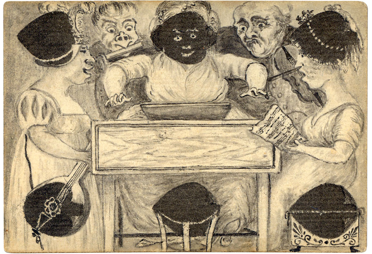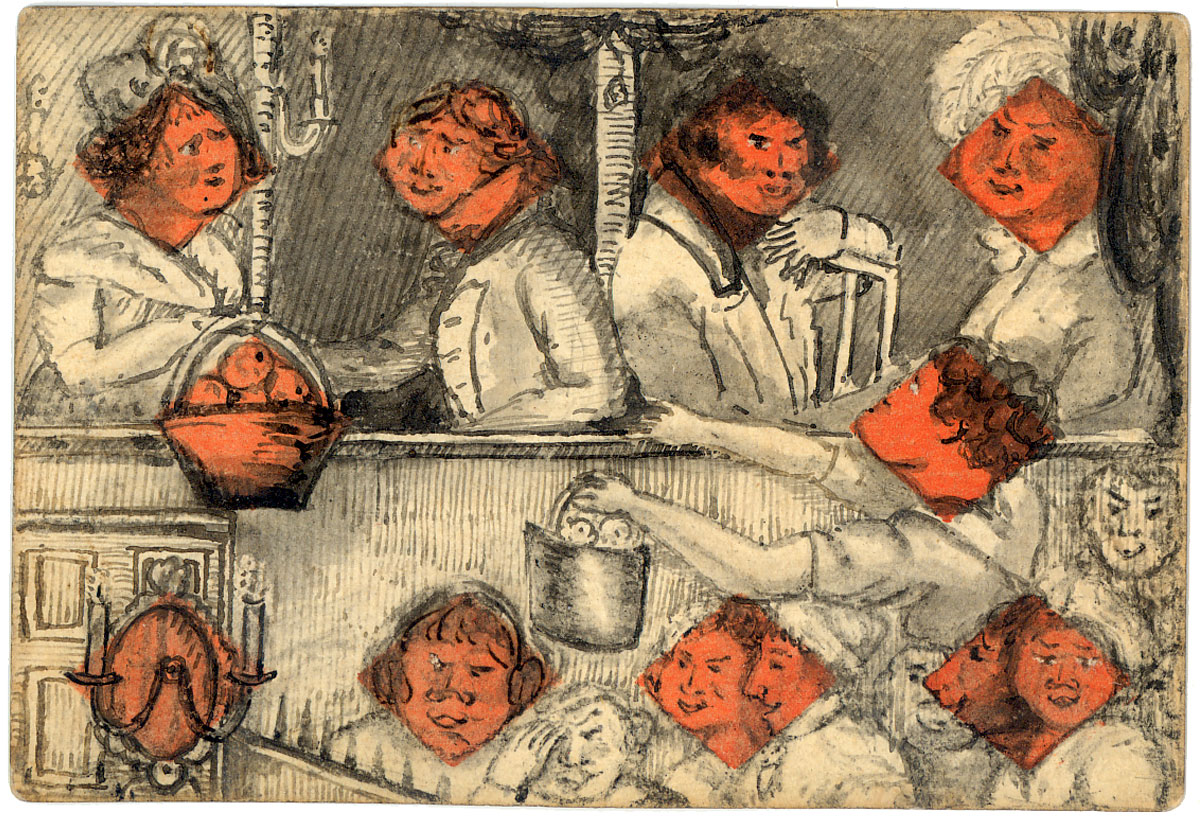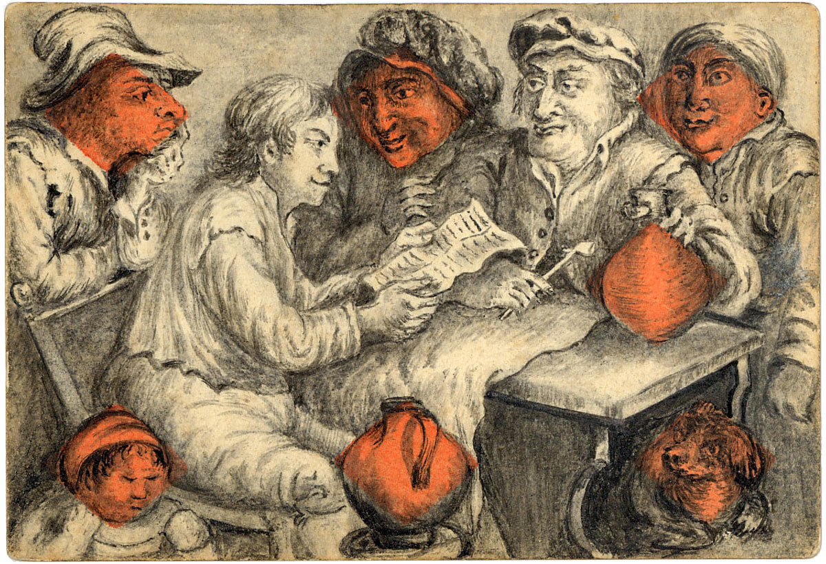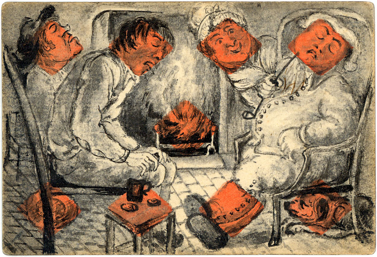 The cards are hand-painted and coloured, some on standard printed cards, artfully incorporating the suit symbols into the images depicting contemporary scenes in late Georgian society. We see folks snoozing by the fireside, smoking pipes, enjoying a musical ensemble, playing card games and a variety of other everyday scenes. In short, a candid documentary glimpse of bourgeois domestic life and manners without pomposity. There is a fascinating range of facial expressions and other details to be enjoyed in these very early cards.