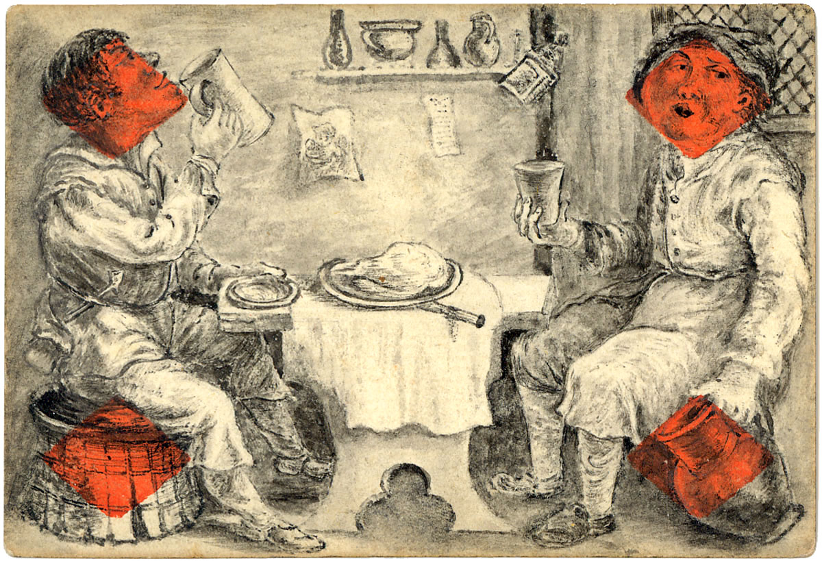 Some of the drawings are executed in landscape format (above) and the rest are portrait (below). Only numeral cards are present and one of them (four of hearts) has the inscription “MES 1819”. The ace of diamonds is from the same artist.