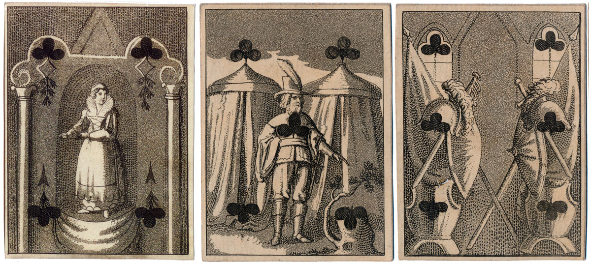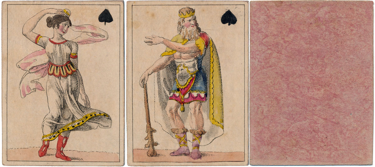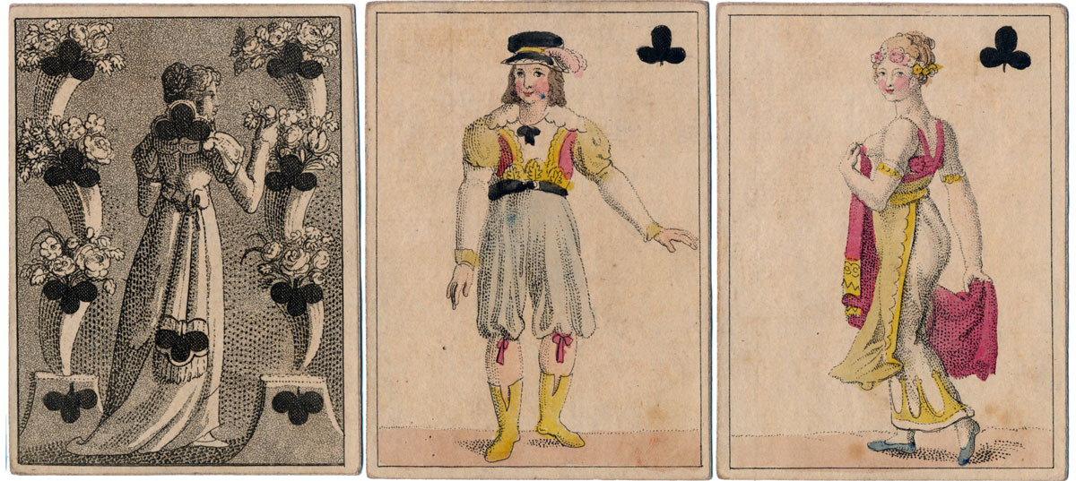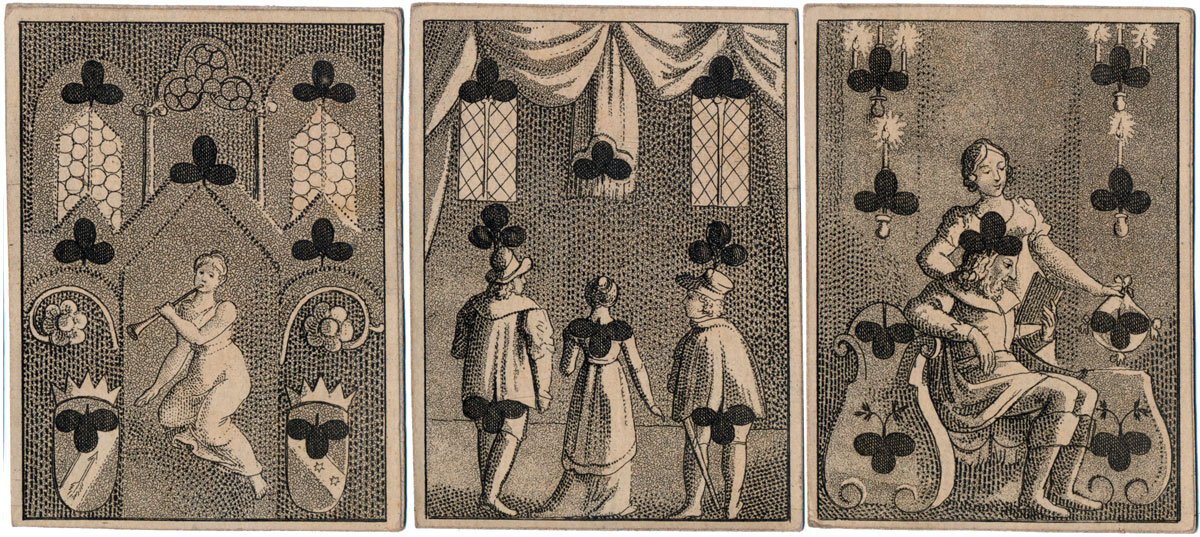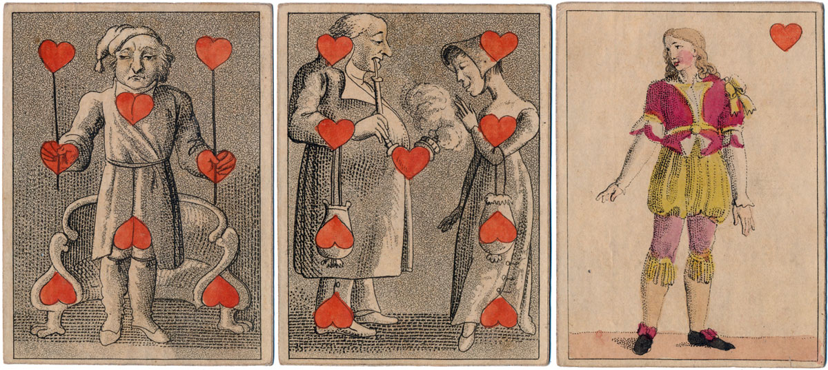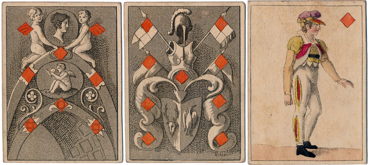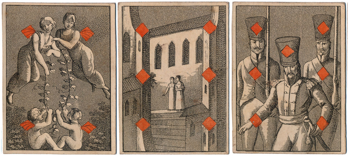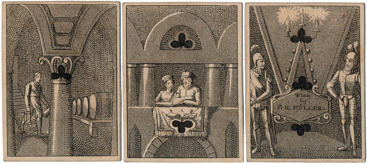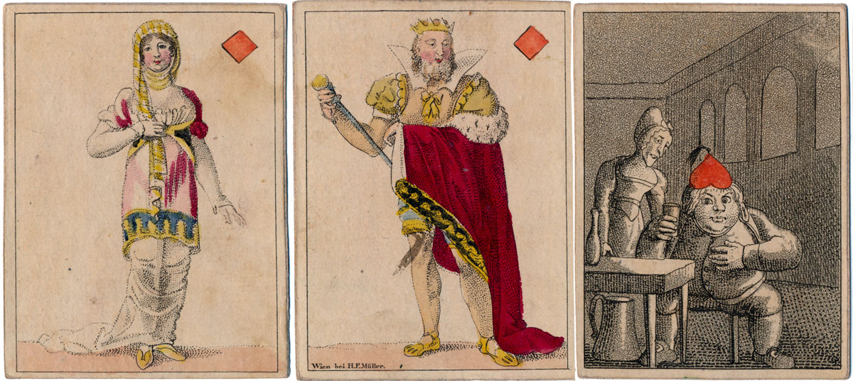In this early Transformation Pack by H.F. Müller of Vienna, whose name can be seen on the 3 of Clubs and King of Diamonds, the court cards are anonymous, perhaps characters of the stage in theatrical costumes. The forty numeral cards contain a collection of delightful period scenes of everyday folks in imaginary stage sets depicted with a subtle sense of humour and excellent characterisation of figures and faces. The maker's initials and trade mark are visible in the 5 of Diamonds (right).
