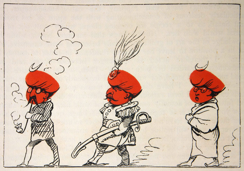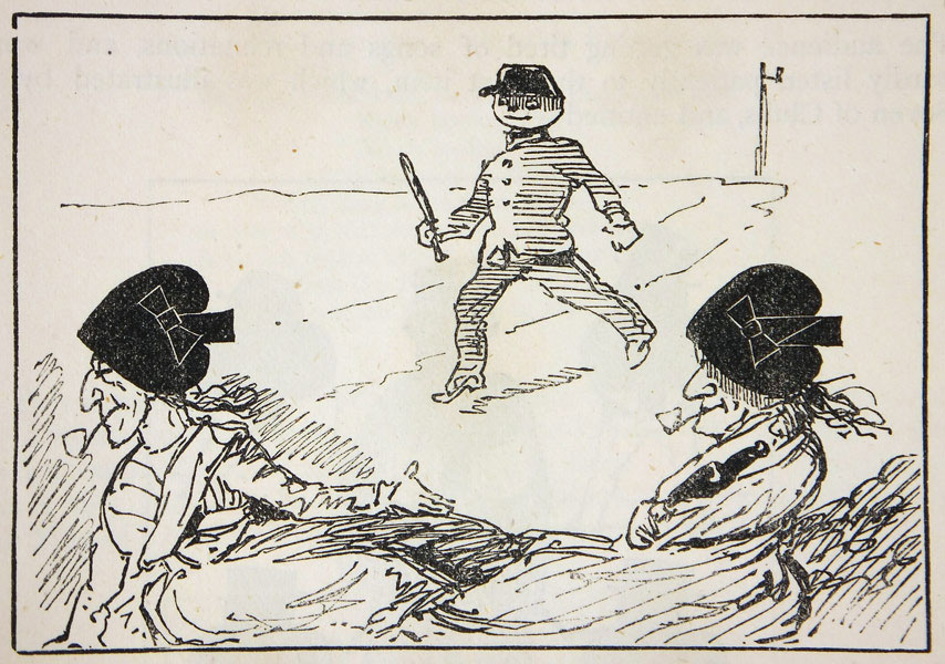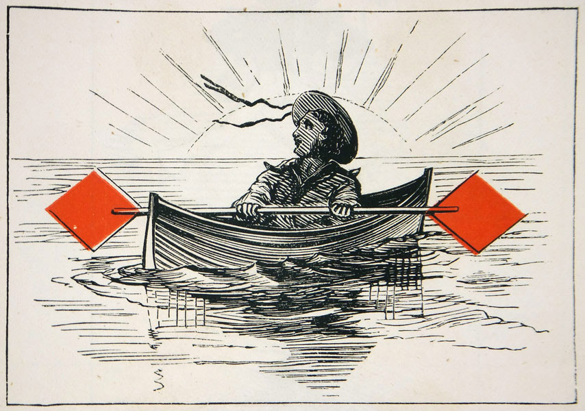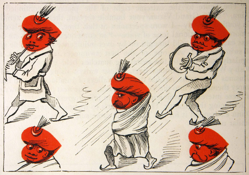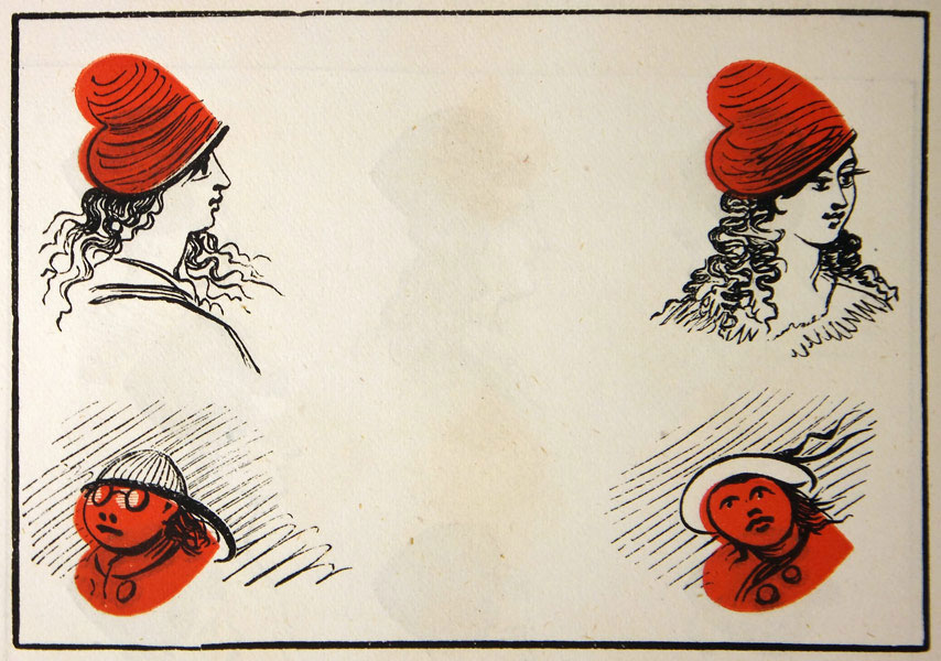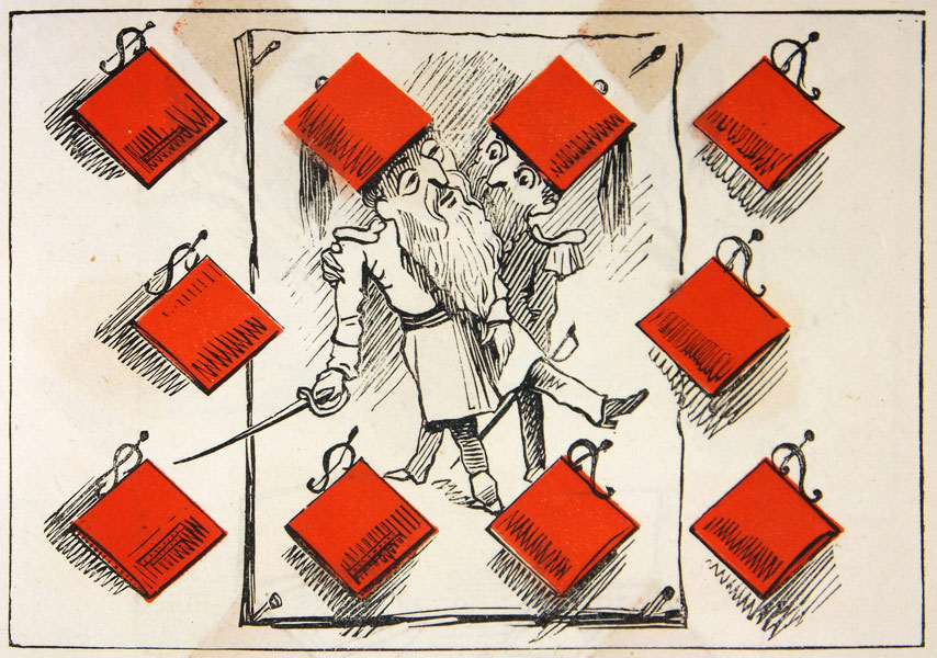 A Christmas Annual titled “On The Cards” or “A Motley Pack” by the Australian writer, dramatist and publisher Garnet Walch (1843-1913, see biography) was published in Melbourne in 1875. The book contains 71 pages with 40 transformed playing cards illustrated by the Scottish born poet and man of letters George Gordon McCrae (1833-1927, see biography) which are relevant to the story in the book. McCrae’s drawing style could be described as “lively and competent sketches in pen and ink which aptly illustrate the scenes being described.” George McCrae also wrote novels, stories, poetry, travel sketches and illustrated books. Some of his sketches may have been inspired by his travels to Mauritius and the Seychelles, as well as by Aboriginal people.