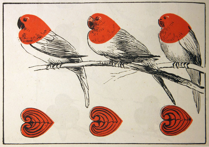 Above: the order of the cards and suits in the book is totally random, following no specific order, just appearing as needed by the text. There are no court cards. There are a fair number of poems that mention the card on the same page, that are also part of the general story being told. There is never more than one card per page.