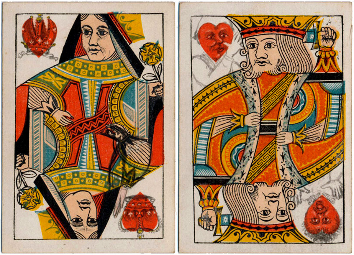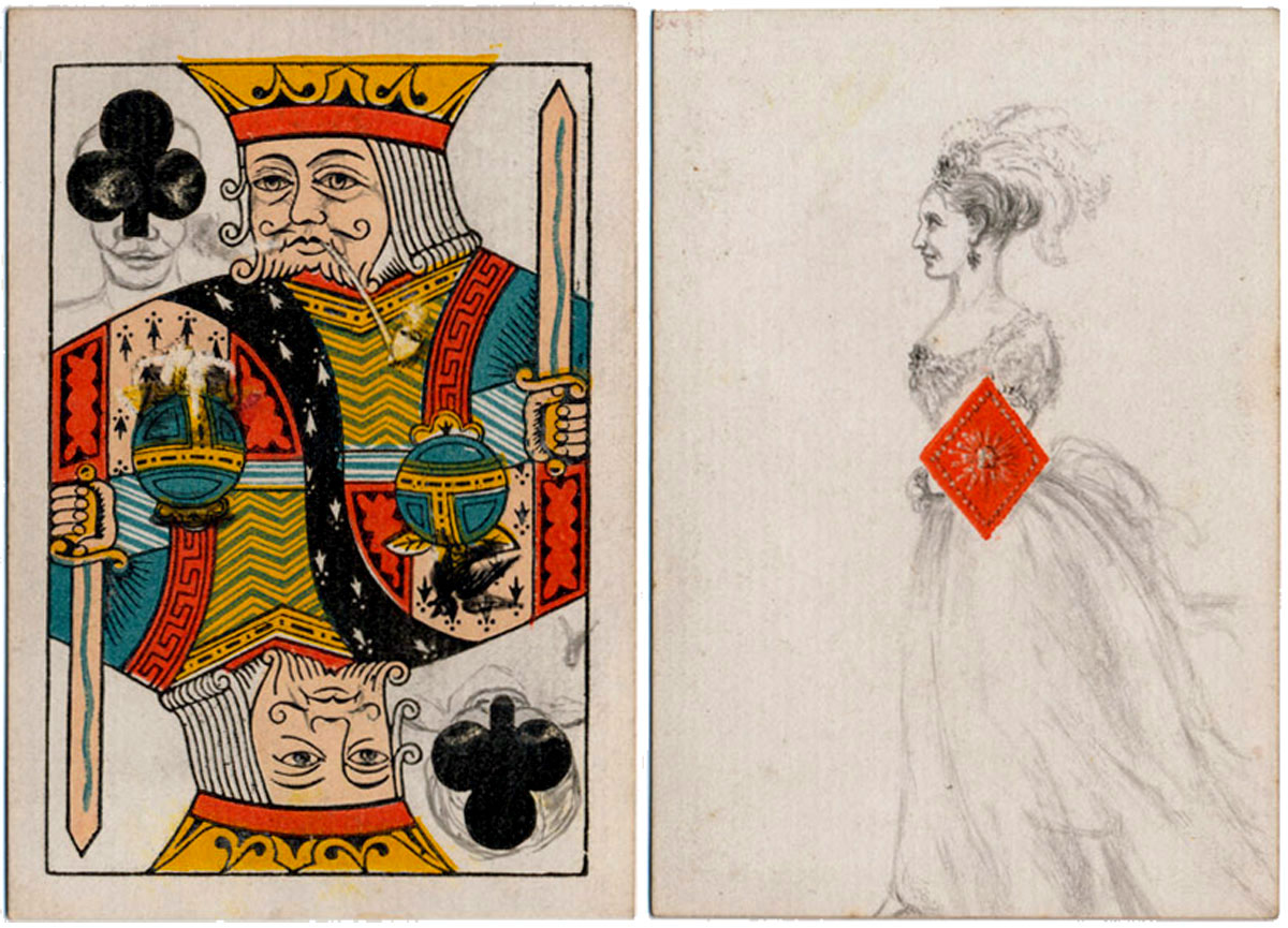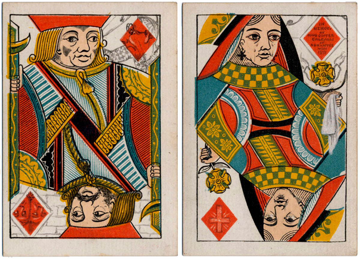 This is a hand-drawn transformation using a pencil on a standard pack made by Hunt’s Playing Card Manufacturing Co (London) and dated 1874. The repertoire of images on the cards includes various animals, flowers, insects, exotic costumes, eccentric persons, dinner parties, quarrels, ladies’ hats, fishes, a scientific experiment, a card game, oarsmen, a marriage, swimmers, infantry, a musical gathering, pipe smokers and a stage coach. There is also a reference to King Coffee Calcalli (QD) as well as fetish items such as skulls, cannibalism and devils. Possibly there is a connection with British rule in the Gold Coast of Africa and The Ashantee War. Some interesting amendments have also been made to the court cards.