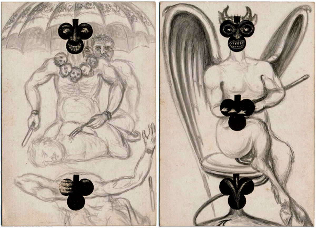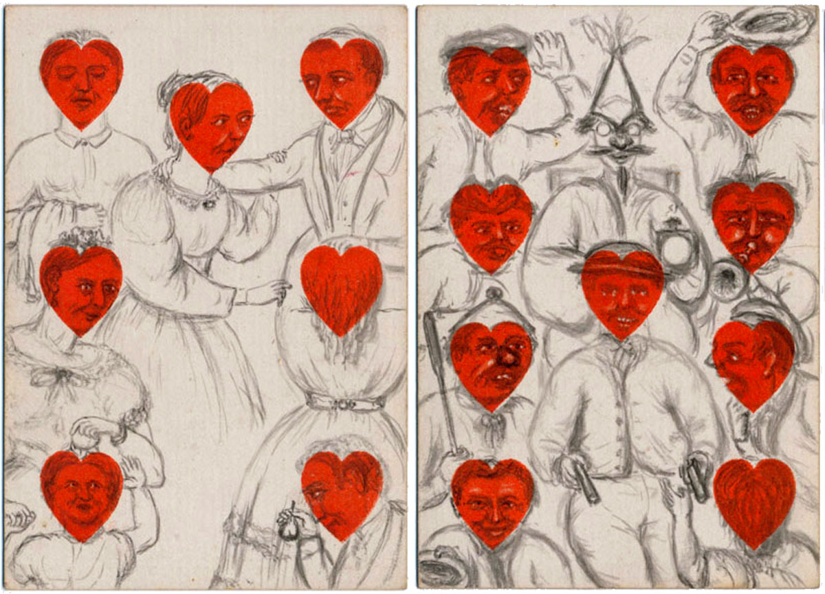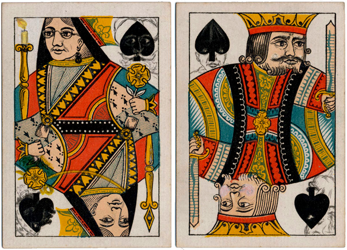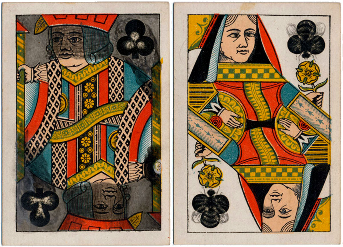 This is a hand-drawn transformation using a pencil on a standard pack made by Hunt’s Playing Card Manufacturing Co (London) and dated 1874. The repertoire of images on the cards includes various animals, flowers, insects, exotic costumes, eccentric persons, dinner parties, quarrels, ladies’ hats, fishes, a scientific experiment, a card game, oarsmen, a marriage, swimmers, infantry, a musical gathering, pipe smokers and a stage coach. There is also a reference to King Coffee Calcalli (QD) as well as fetish items such as skulls, cannibalism and devils. Possibly there is a connection with British rule in the Gold Coast of Africa and The Ashantee War. Some interesting amendments have also been made to the court cards.