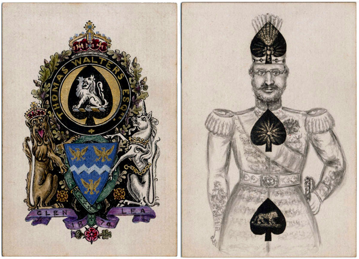 The artist has customised the ace of spades by turning the shield into Thomas Walters’ family coat-of-arms, adding the name of his home as the motto. The supporting lion and unicorn, as well as the coronet etc., are of course part of the original ace of spades. The pack contains two self-portraits (3 Spades, 10 Hearts), presumably Thomas Walters Esq. himself, one in full dress uniform.
