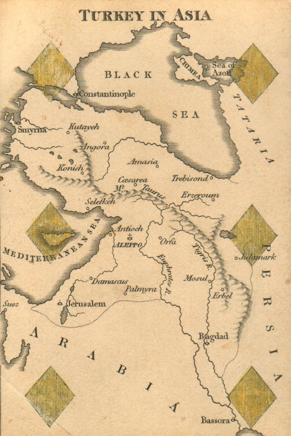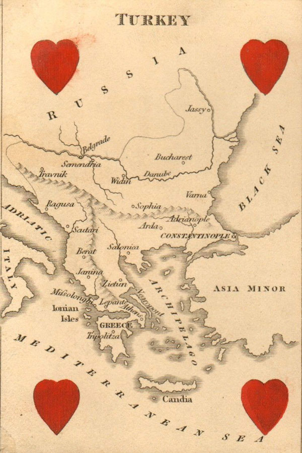 Playing cards were not common during the Ottoman Empire due to religious reasons, and there are hardly any examples of 19th-century playing cards being imported. In a recent ordinance regarding the same type of card, Turkey imposed a 1984 law stipulating that cards had to be sold in hospitals and pharmacies. The profit from the sale went to the Turkish Red Crescent, the counterpart of the Red Cross.